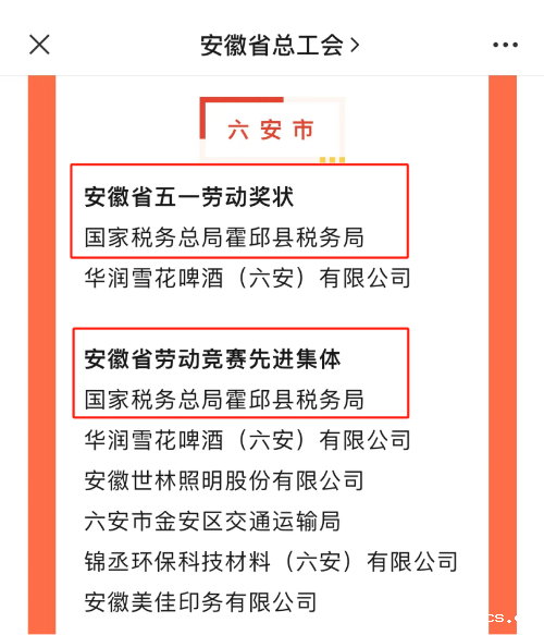 近日,国家税务总局霍邱县税务局荣获“安徽省五一劳动奖状”和“安徽省劳动竞赛先进集体”两项荣誉表彰。