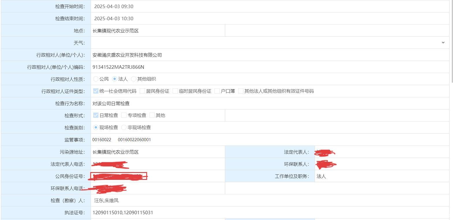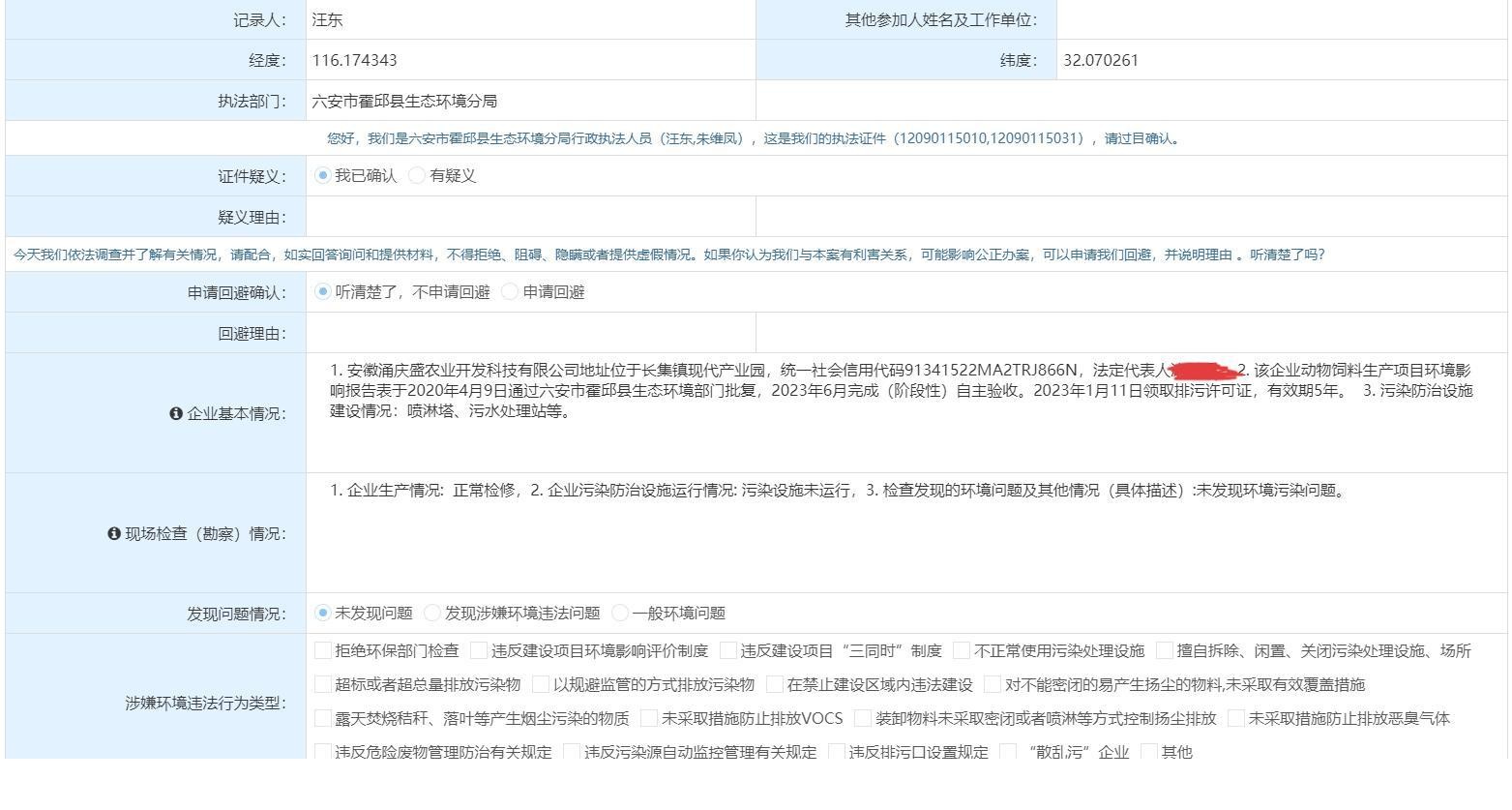六安市霍邱县生态环境分局现场检查(勘察)笔录(“双随机、一公开”)