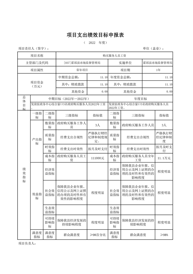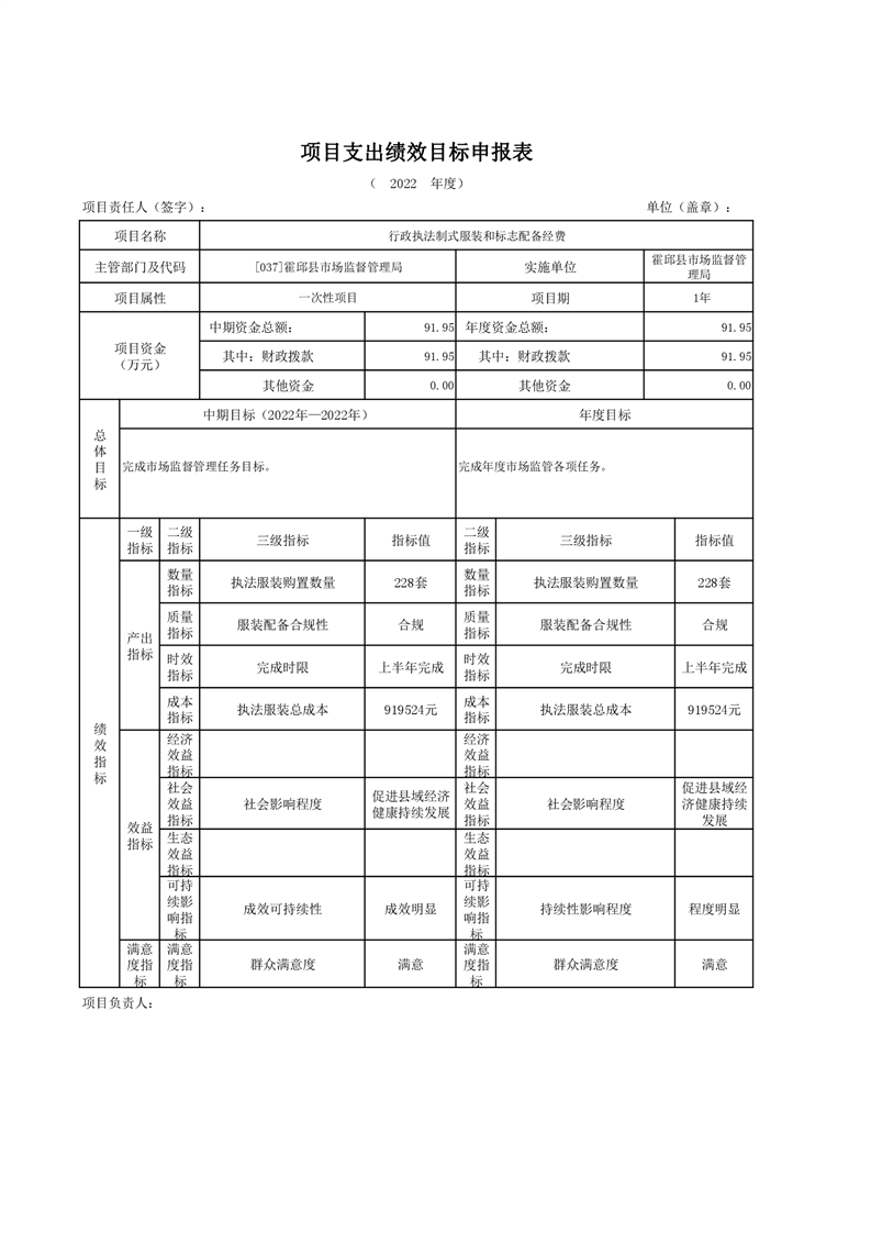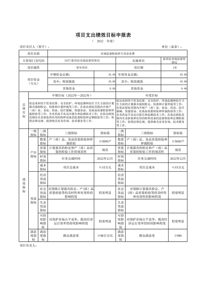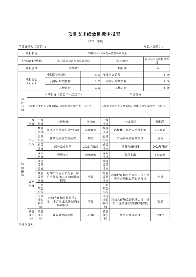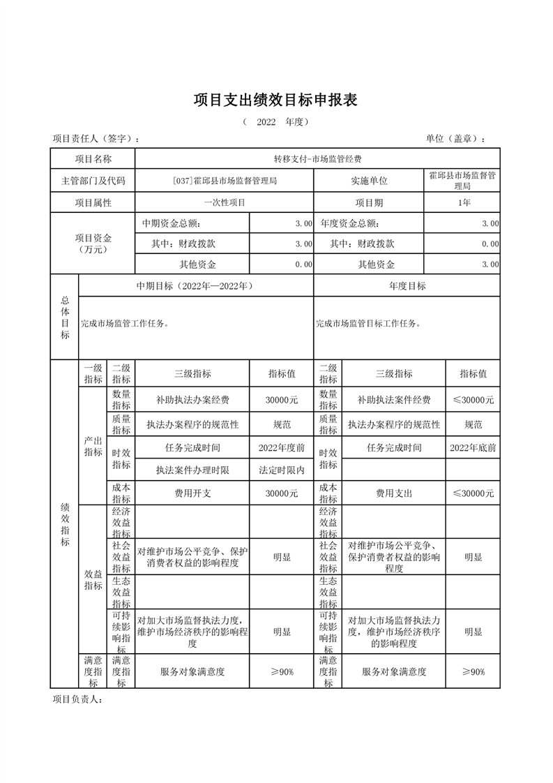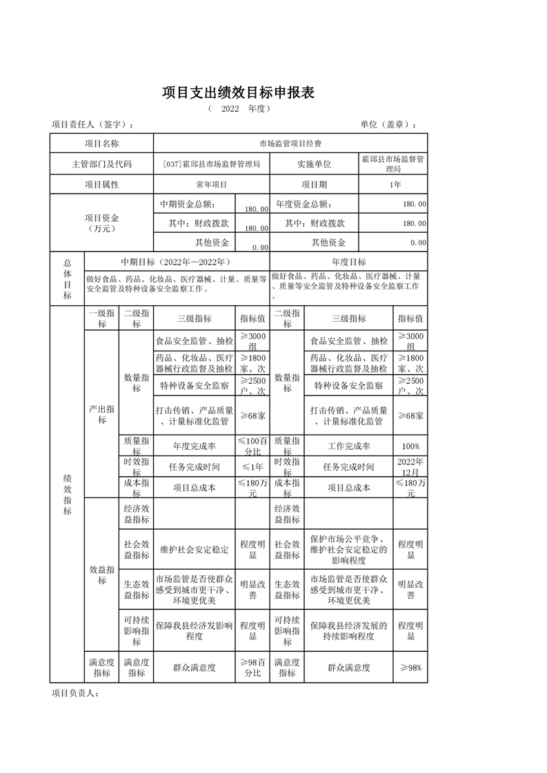 霍邱县市场监督管理局市场监管经费项目支出绩效目标申报表