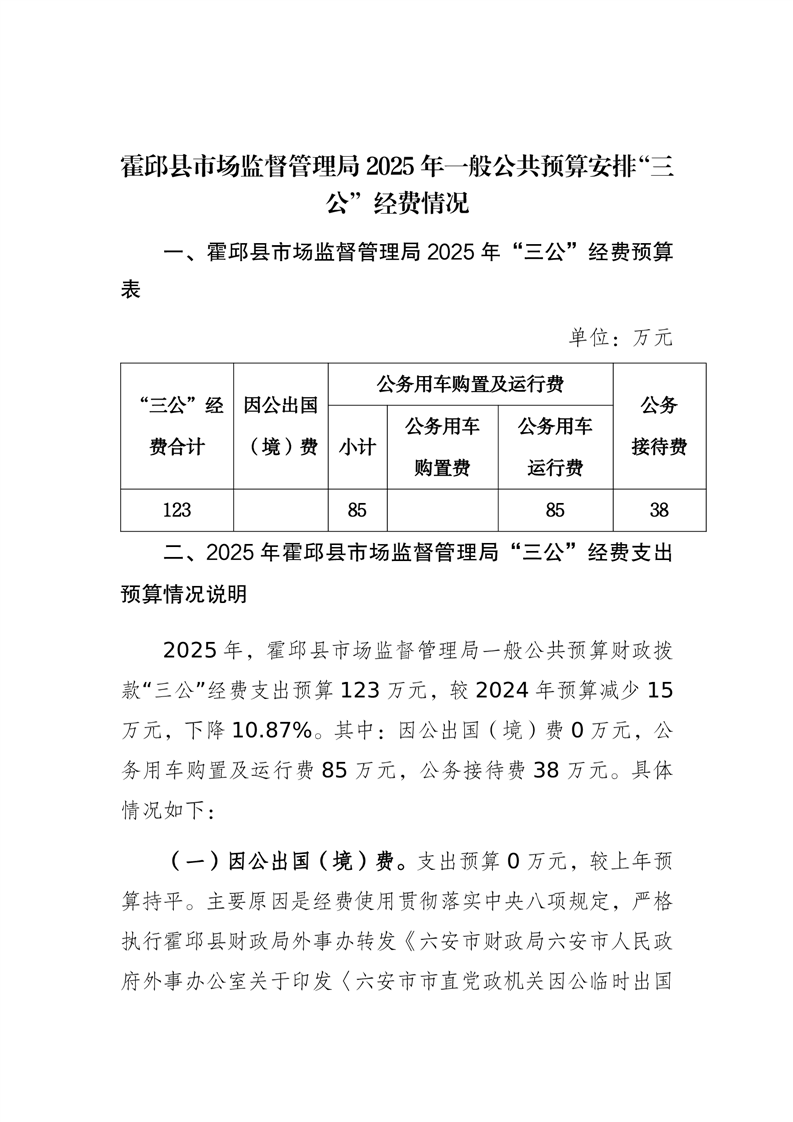霍邱县市场监督管理局2025 年一般公共预算“三公”经费情况