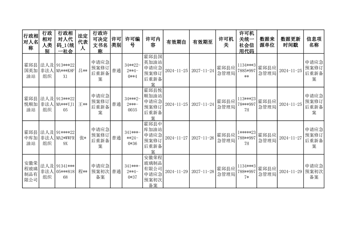 霍邱县应急管理局2024年11月份第四周行政许可结果公示