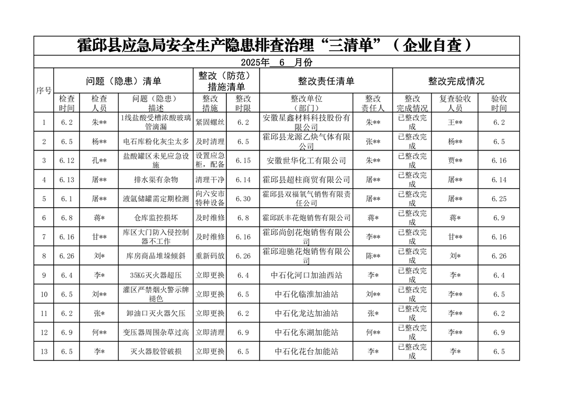 2025年霍邱县应急局安全生产隐患排查治理“三清单”(企业自查)(6月)