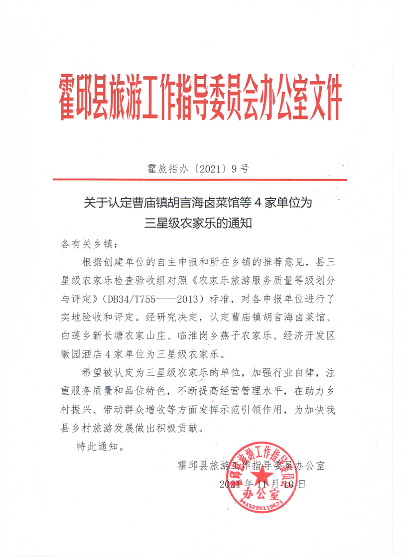 霍邱县文化旅游体育发展中心关于认定曹庙镇胡言海卤菜馆等4家单位为三星级农家乐的通知