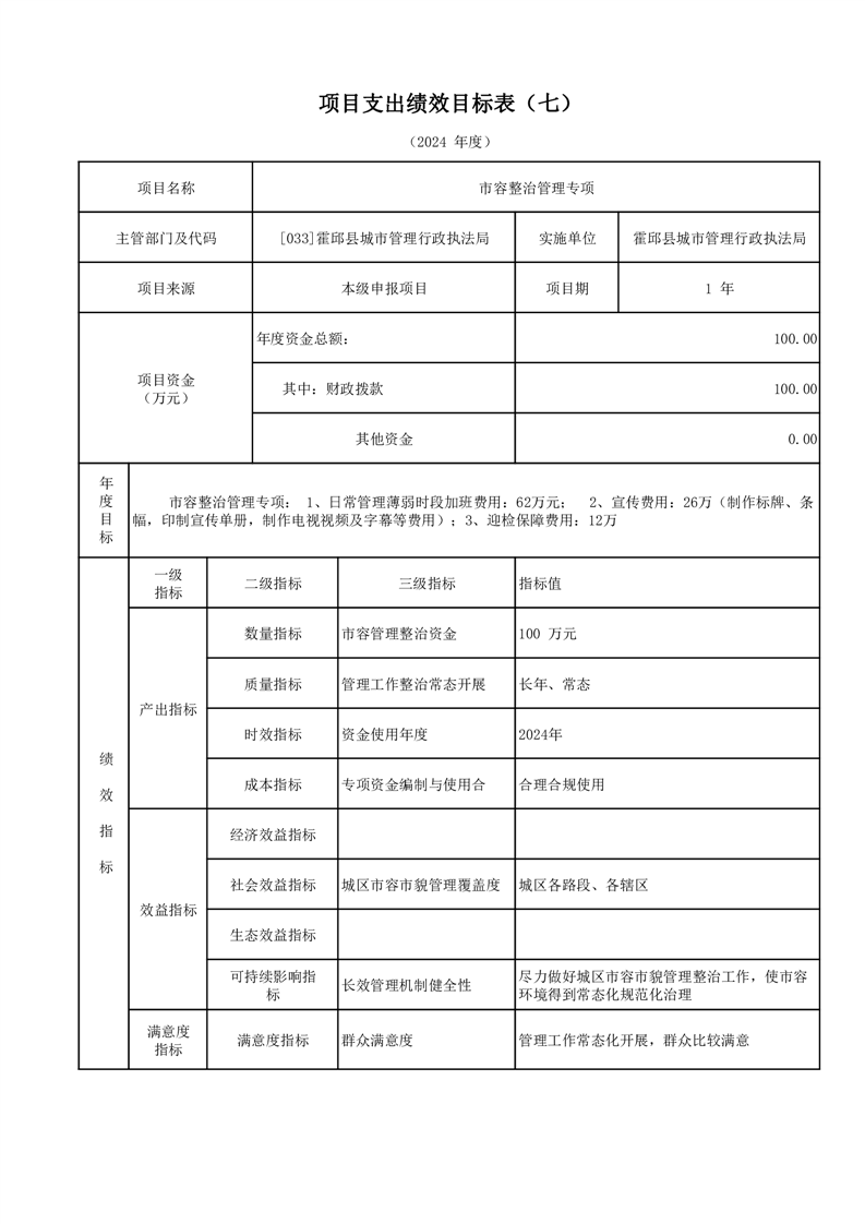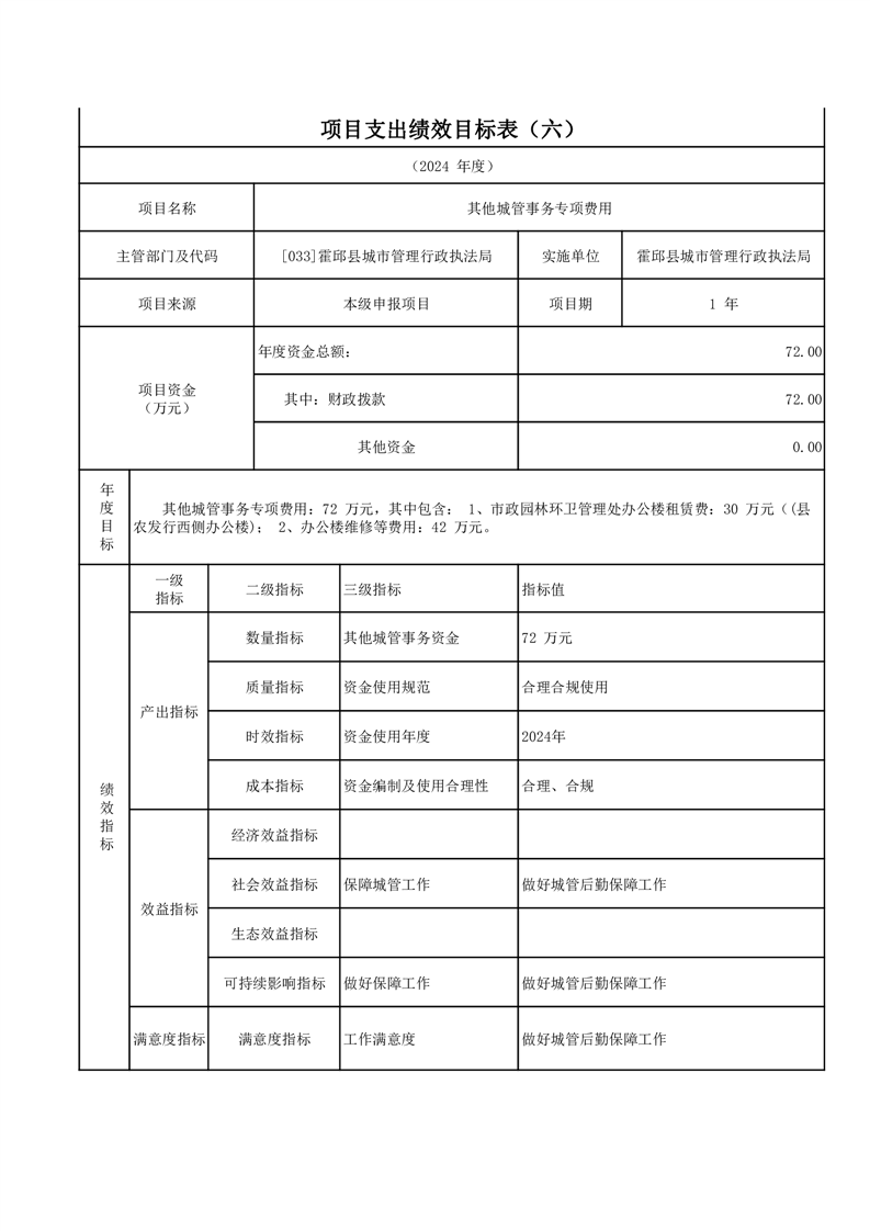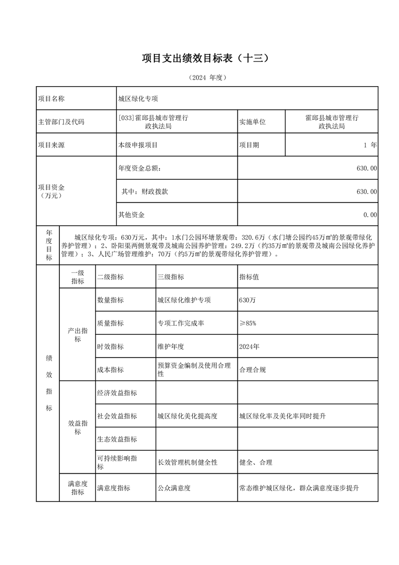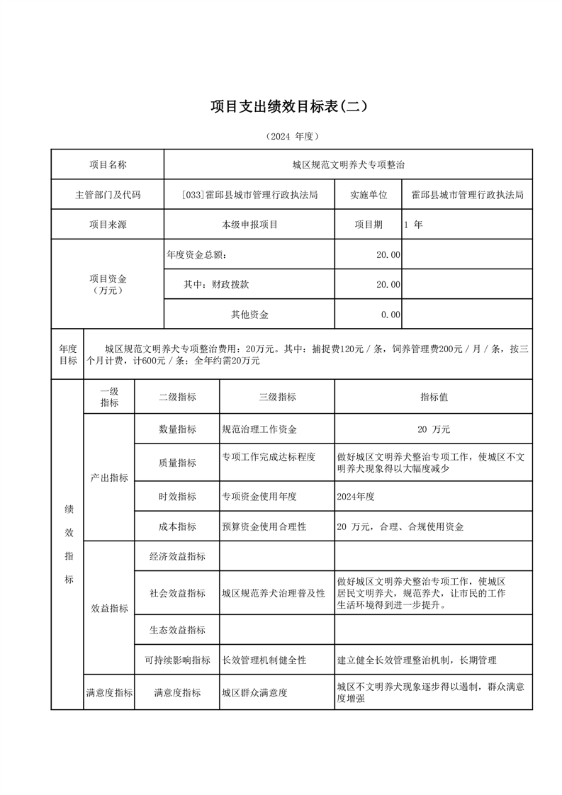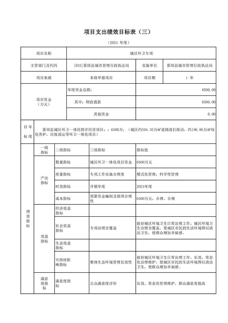 霍邱县城市管理行政执法局2024年度项目绩效目标表