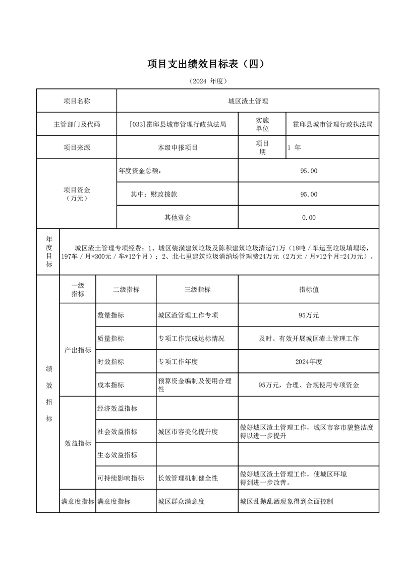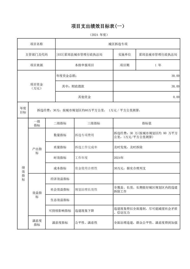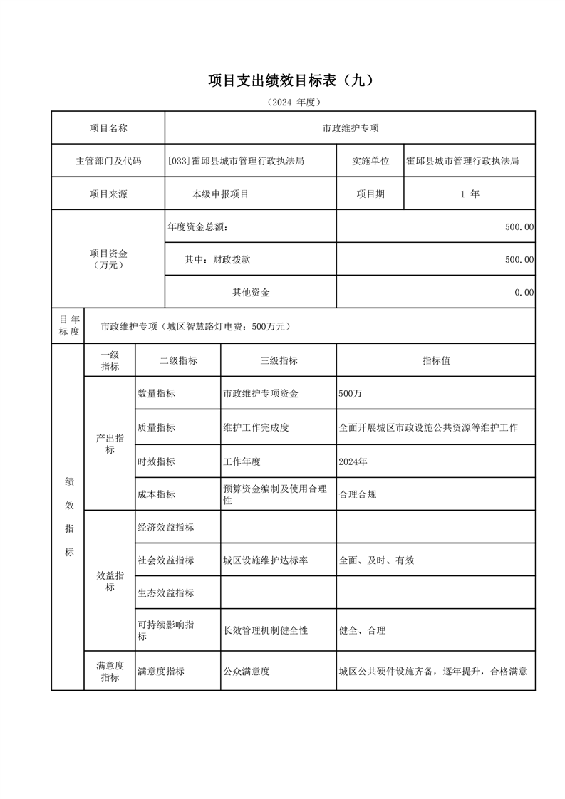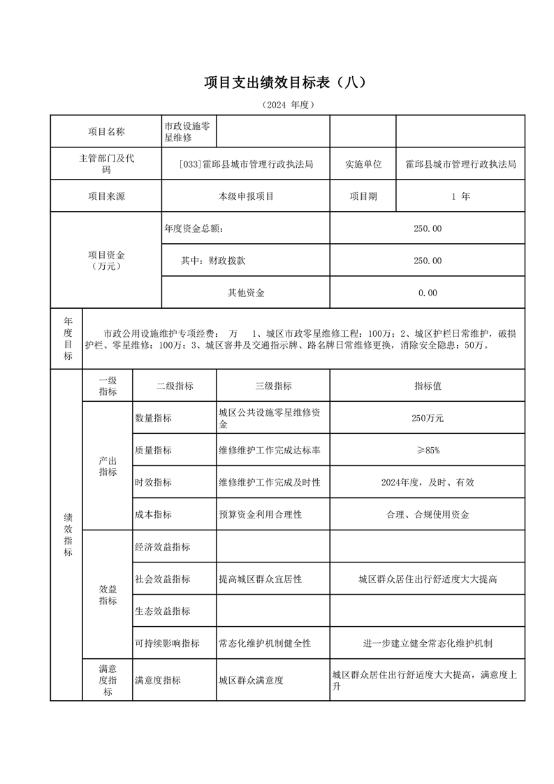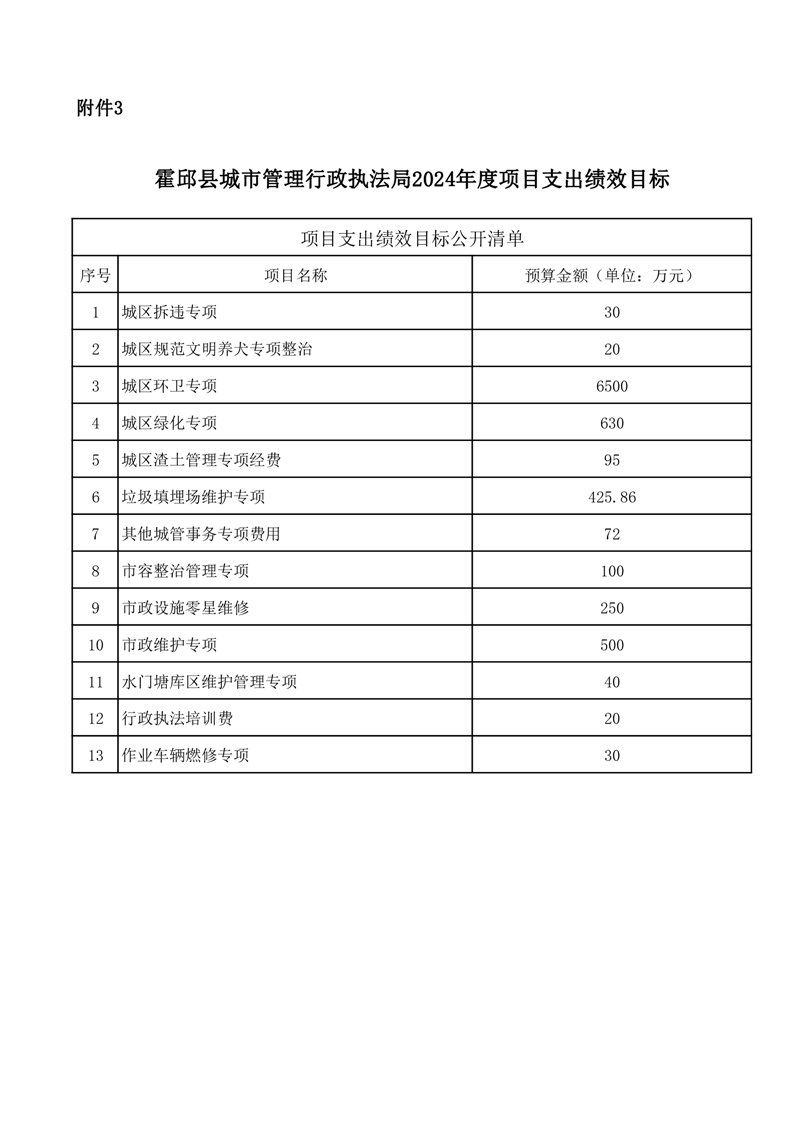 霍邱县城市管理行政执法局2024年度项目绩效目标表