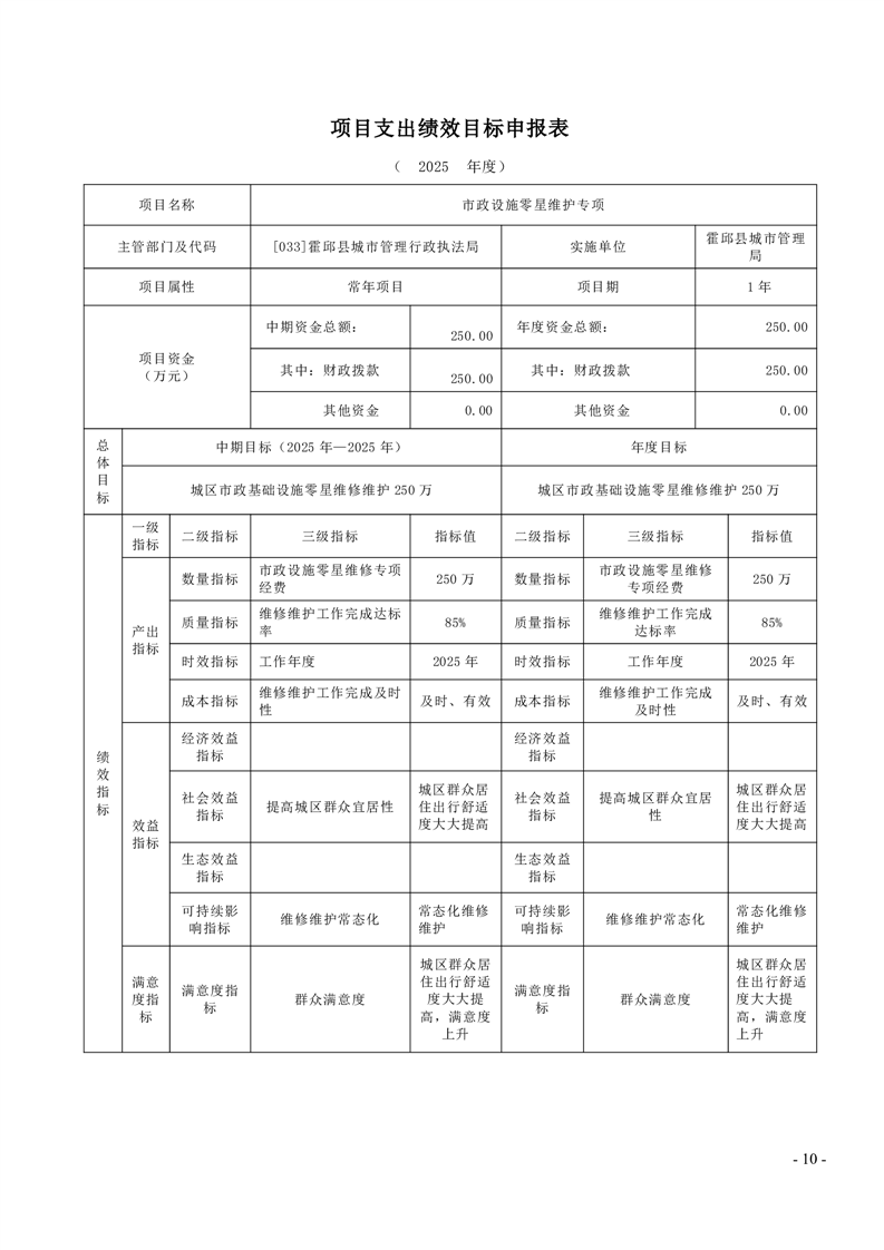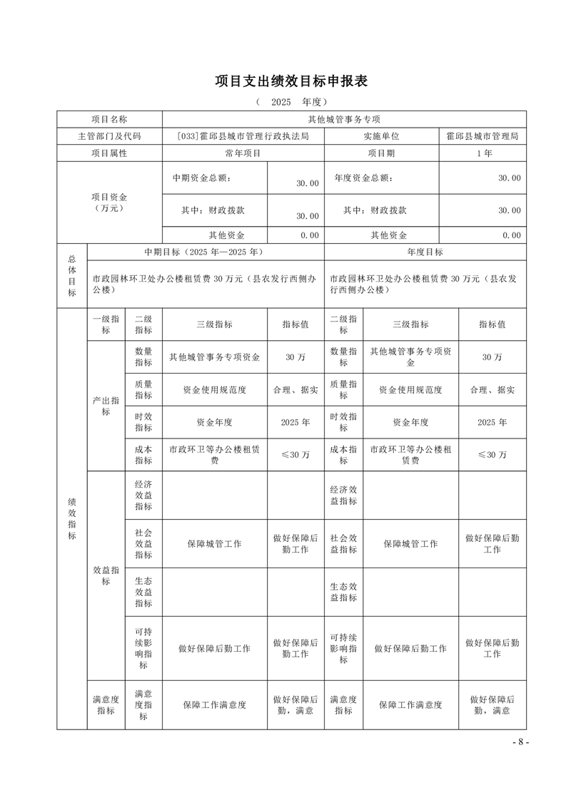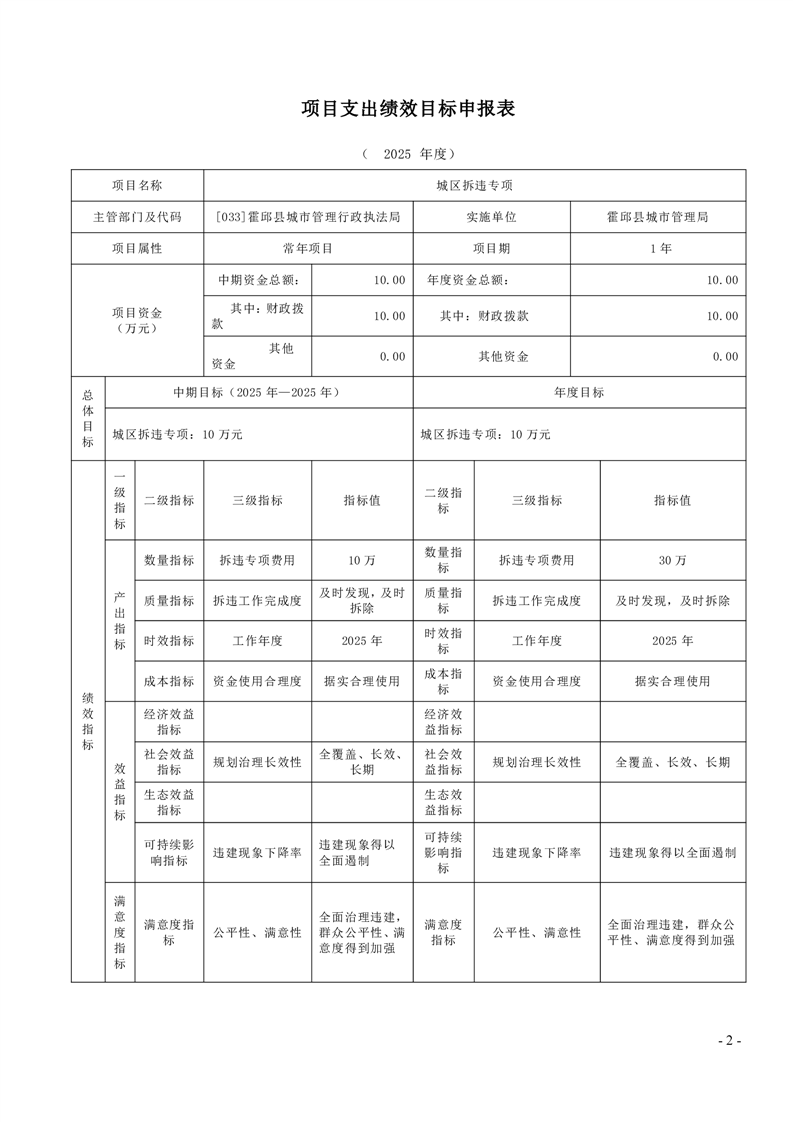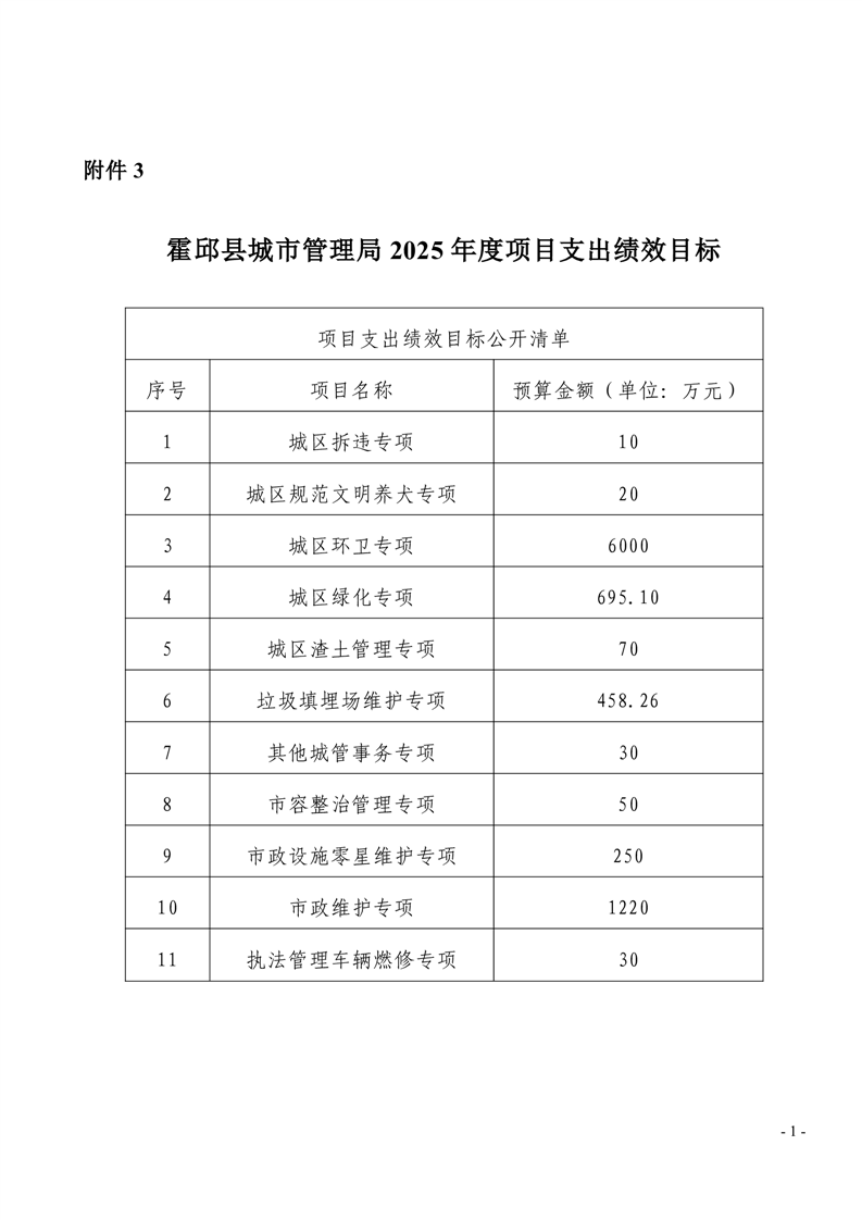霍邱县城市管理局2025年度项目绩效目标表