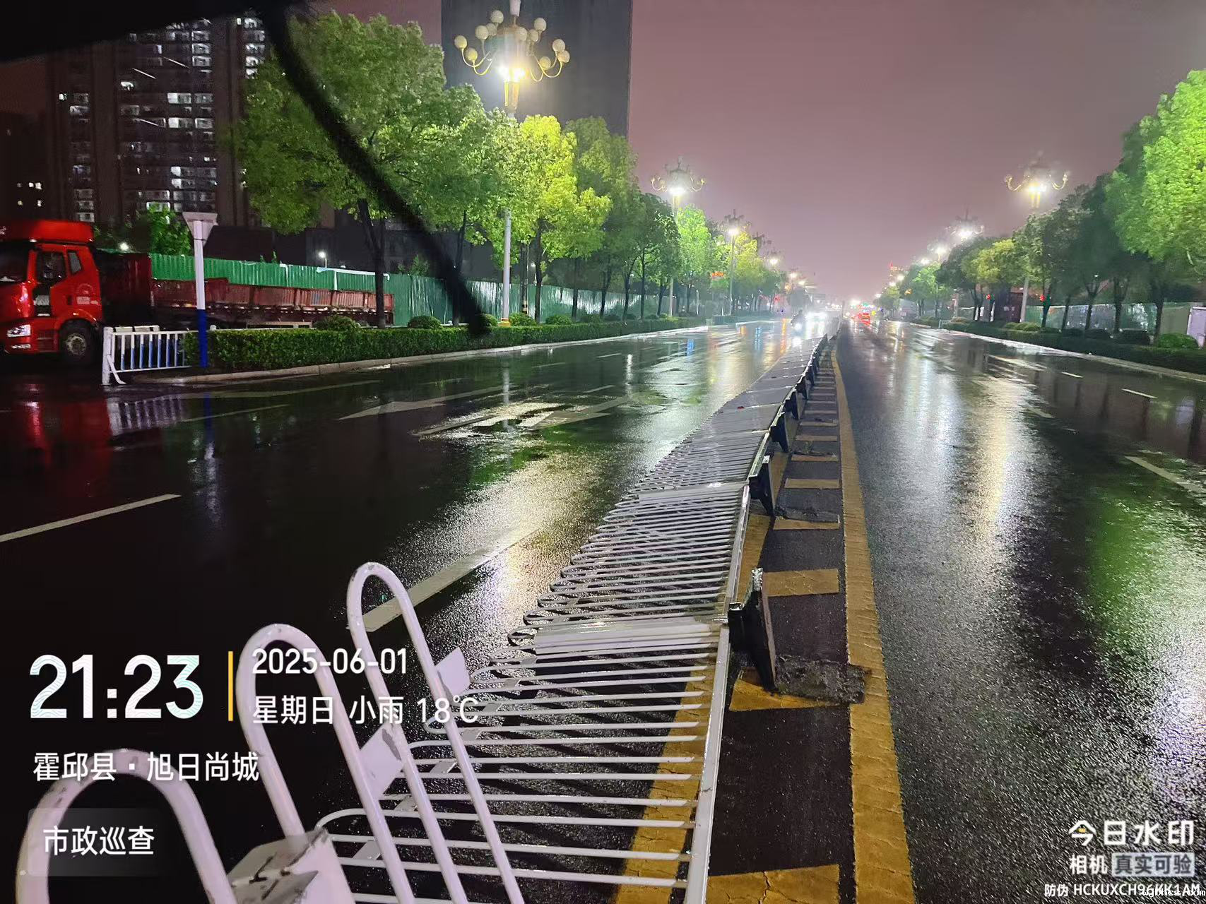 当晚21时15分,市政巡查人员像往常一样,冒雨穿梭在城市的大街小巷。当巡查至旭日尚城附近路段时,他们敏锐地发现道路中央的隔离护栏出现了损坏,部分护栏倒伏在路面上。这不仅严重影响了道路的美观,更对雨夜中视线不佳的过往车辆和行人构成了极大的安全隐患。