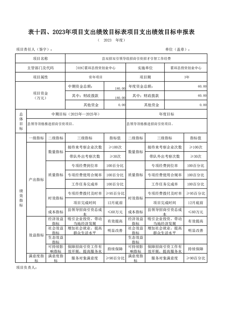 霍邱县投资创业中心2023年部门项目绩效目标表