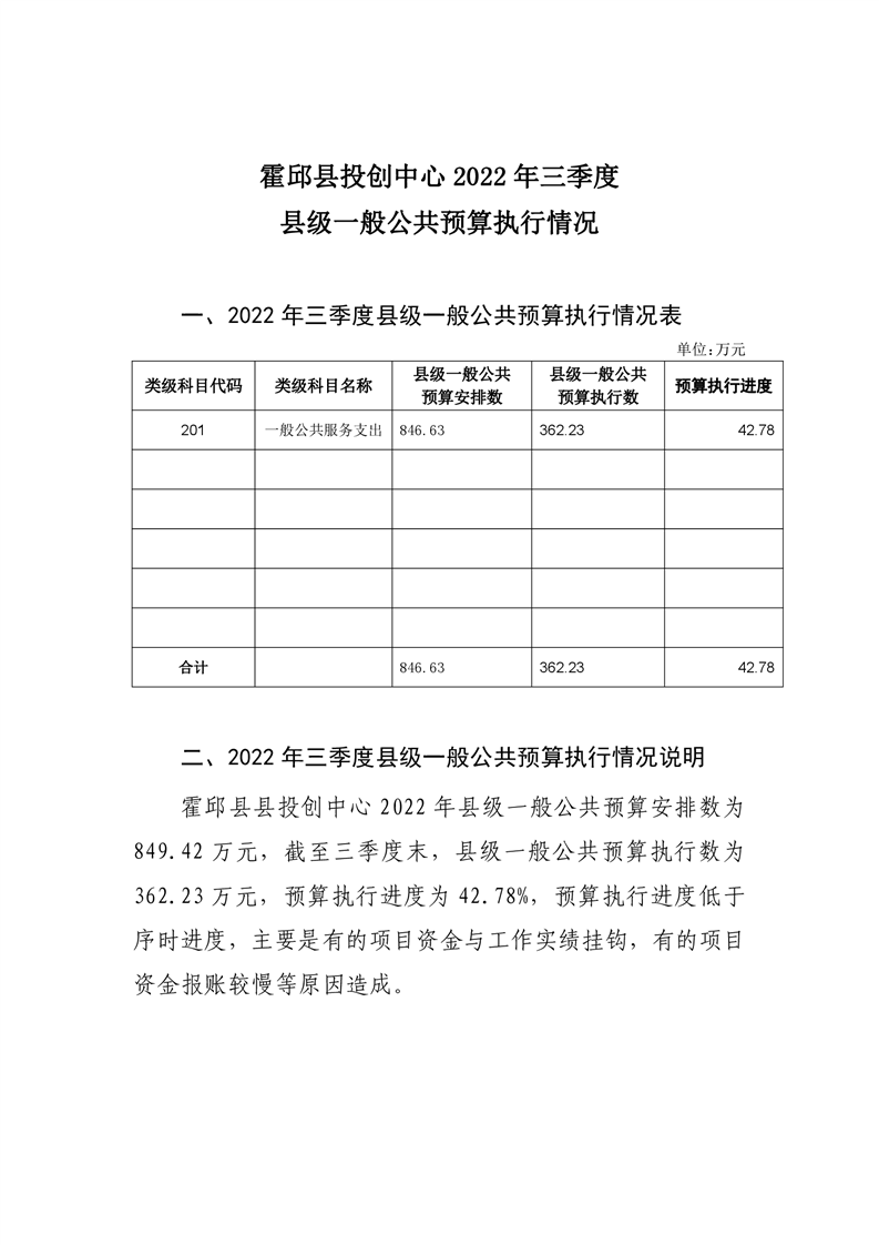 霍邱县投创中心2022年三季度县级一般公共预算执行情况