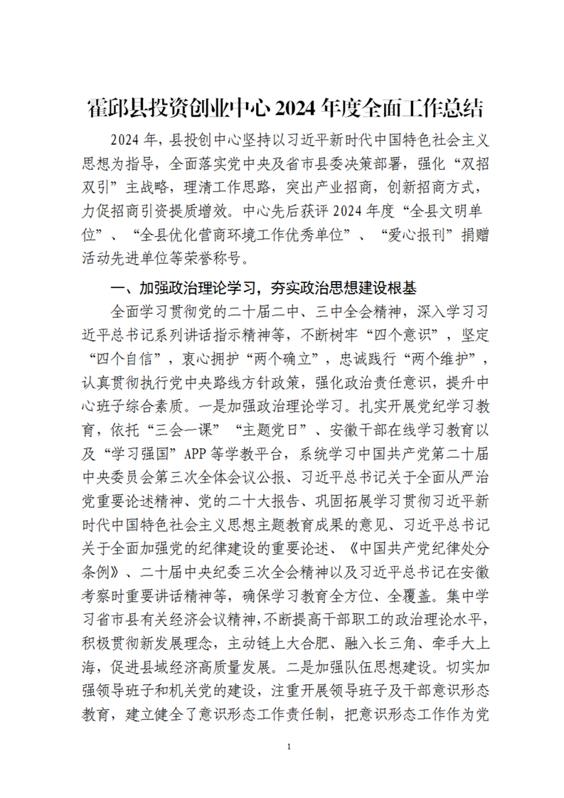 【全面】霍邱县投资创业中心2024年度全面工作总结