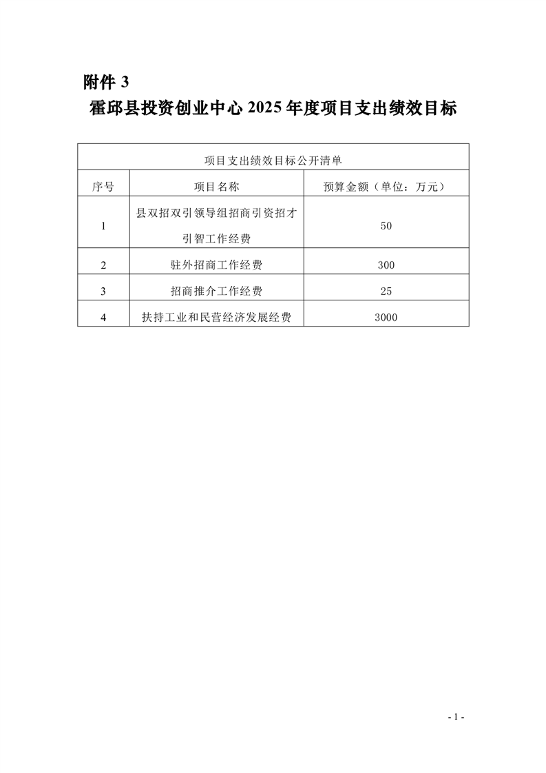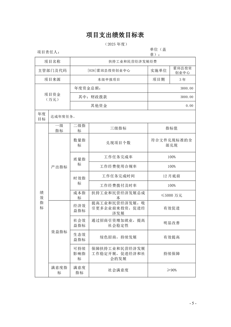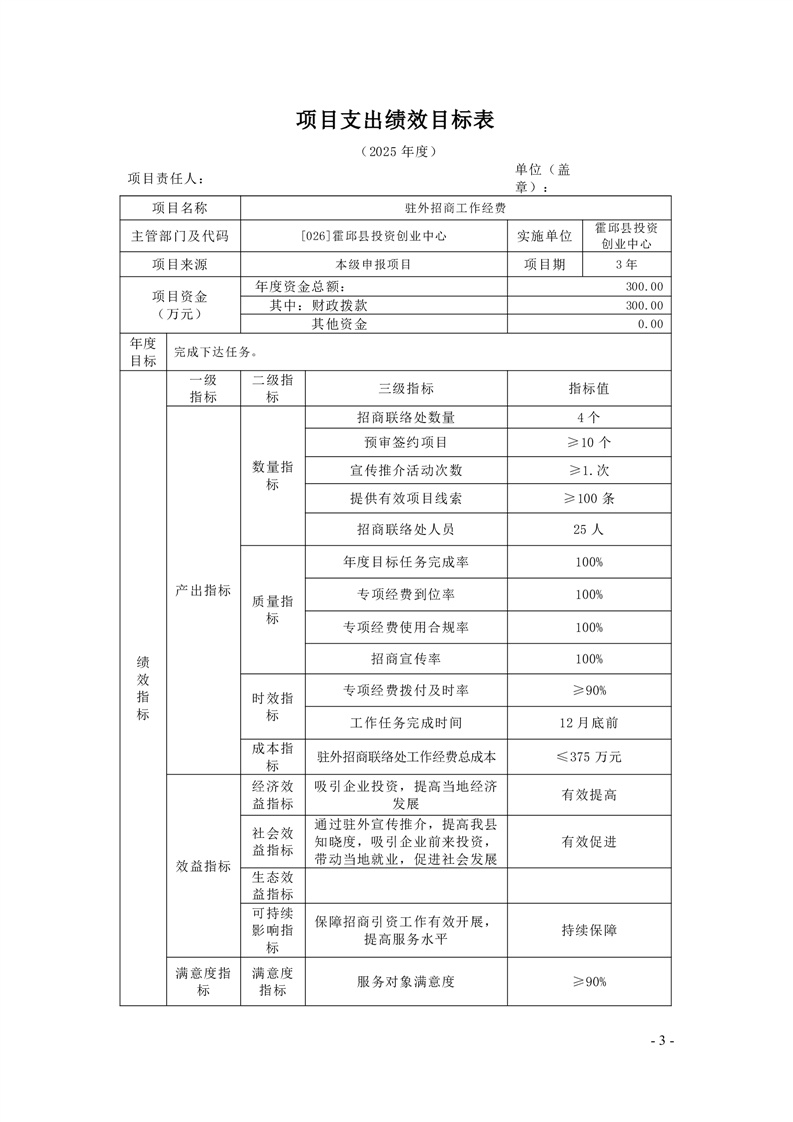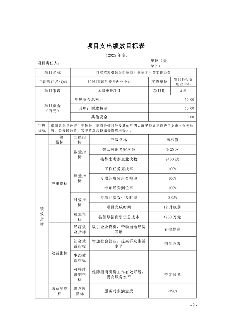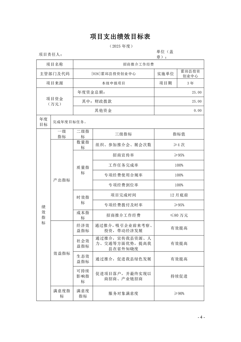 霍邱县投资创业中心2025年度项目支出绩效目标表