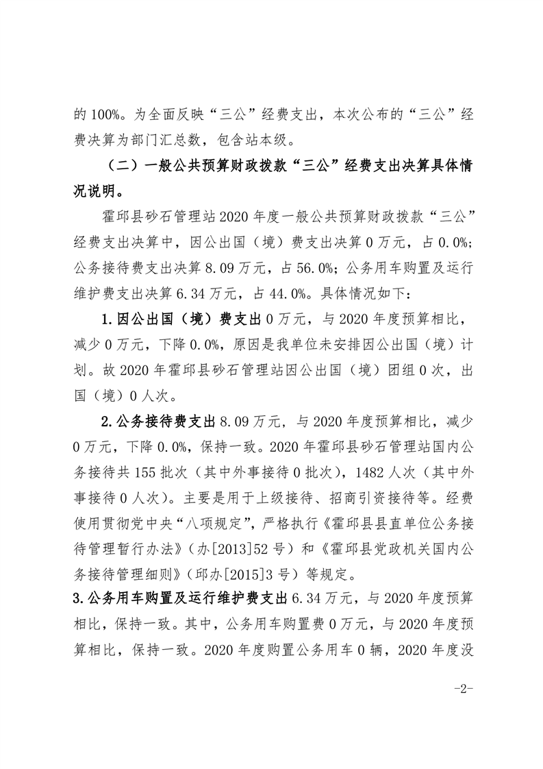 霍邱县砂石管理站 2020 年度一般公共预算财政拨款 “三公”经费支出决算情况说明