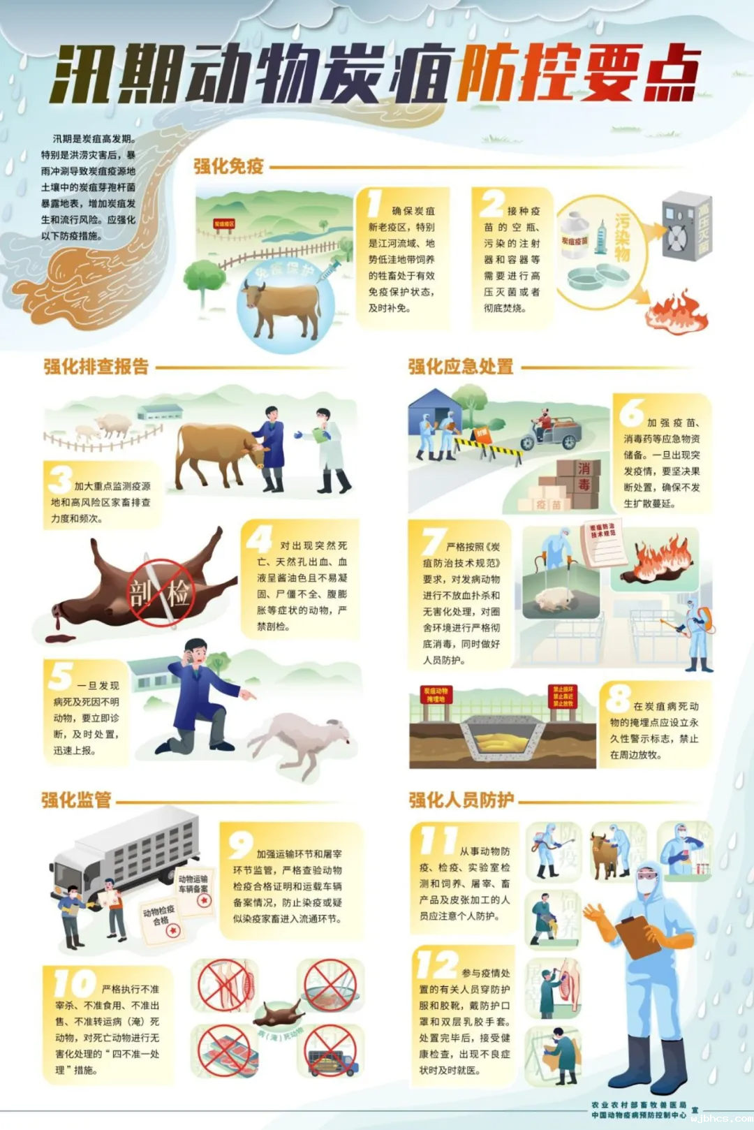 严格落实重大动物疫情24小时应急值班制度,出现突发状况,按规定及时报告和处置。加强应急物资储备,根据疫病流行风险,强化消毒剂、防护用品、疫苗、驱虫药等应急物资储备。关注所在地的防汛形势,充分利用官方网站、抖音、微信、微博等平台宣传汛期养殖防灾减灾知识,提高养殖场户风险防范意识。