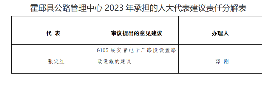 霍邱县公路管理中心2023年承担的人大代表建议责任分解表