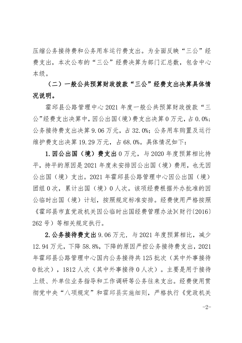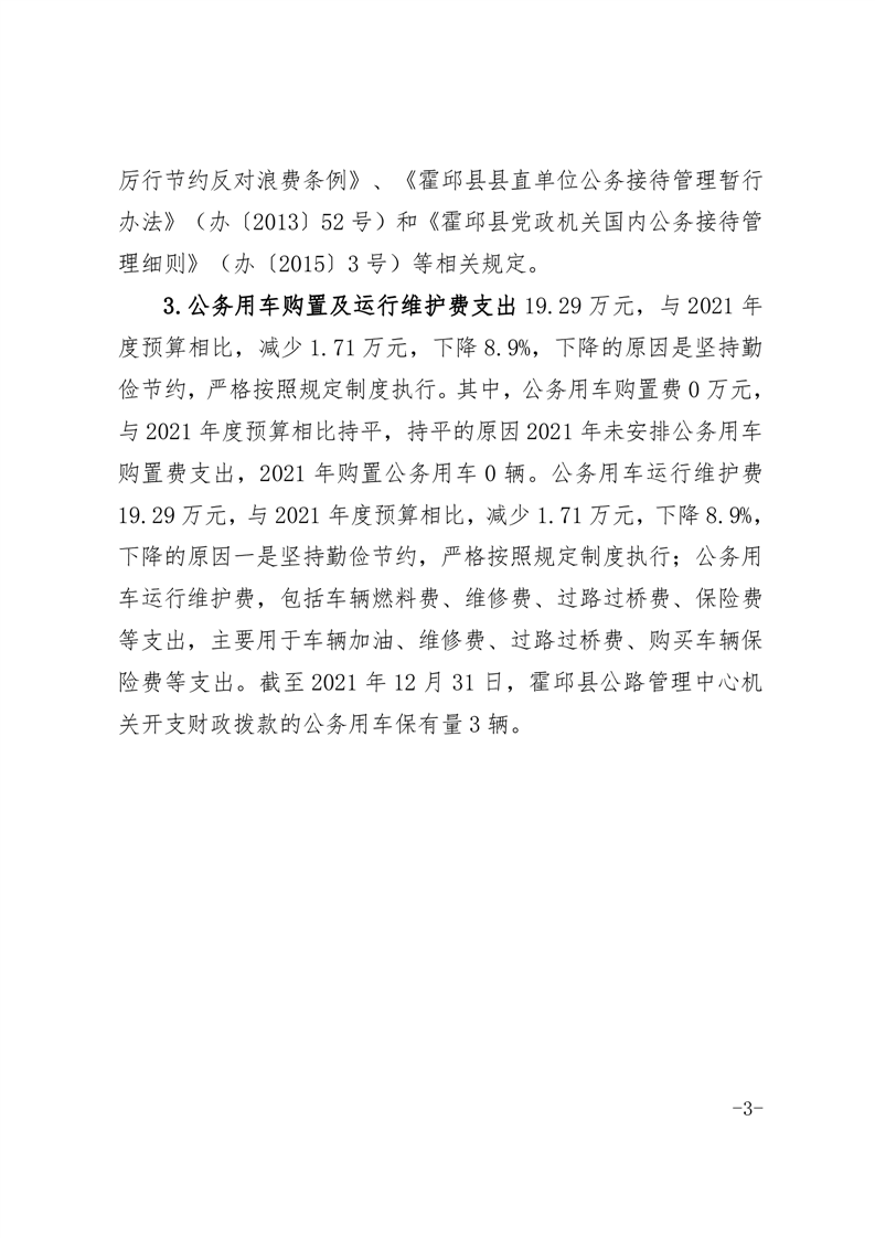 霍邱县公路管理中心 2021年度一般公共预算财政拨款“三公”经费支出决算情况说明