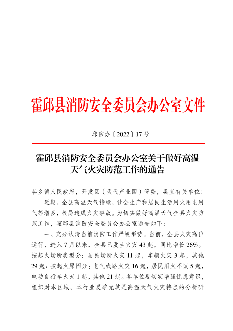 霍邱县供销社转发《霍邱县消防安委员会办公室关于做好高温天气火灾防范工作的通告》