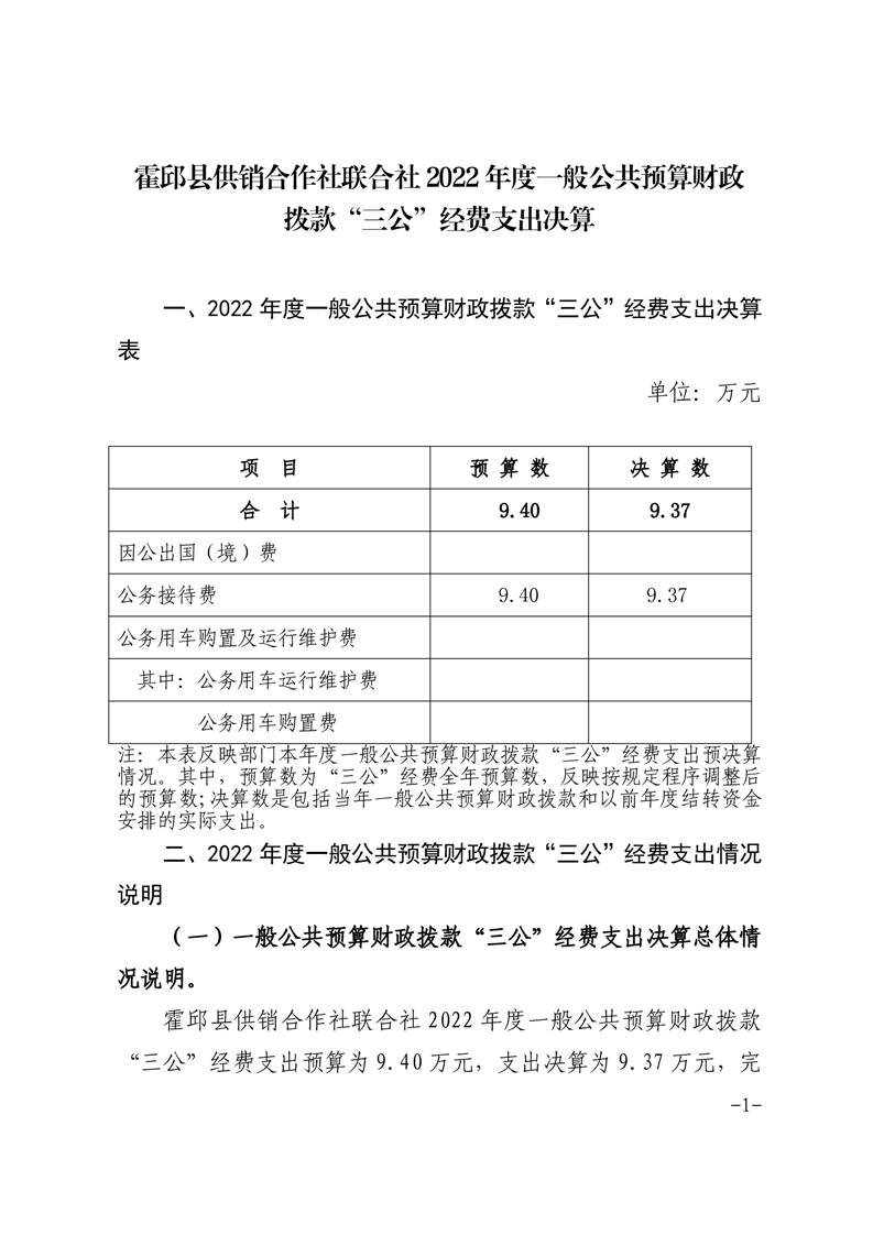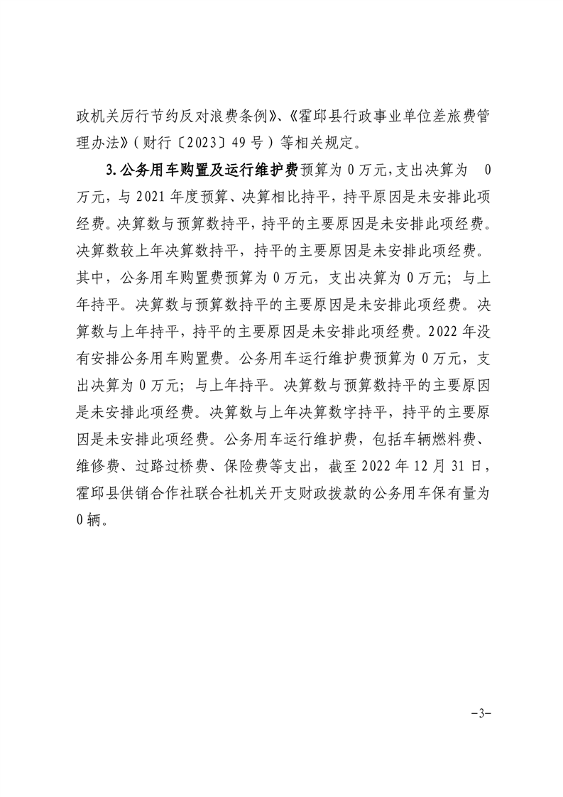 霍邱县供销合作社联合社2022年度一般公共预算财政拨款“三公”经费支出决算