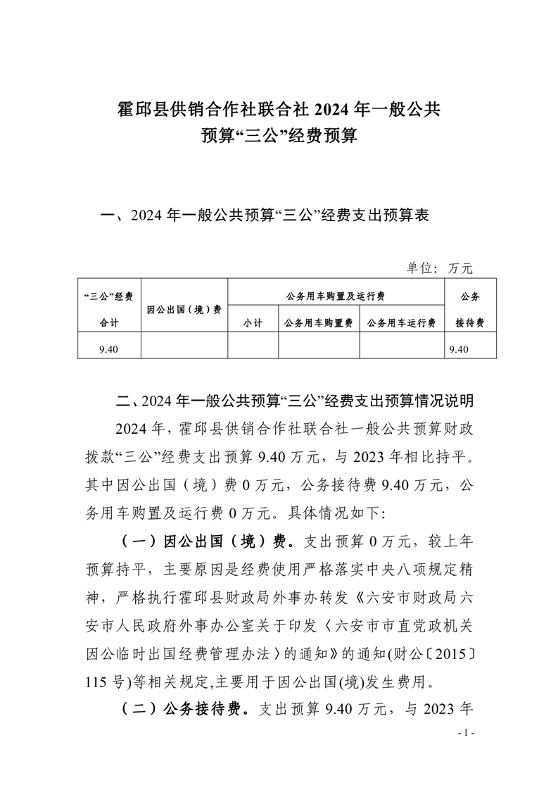 霍邱县供销合作社联合社2024年一般公共预算“三公”经费预算