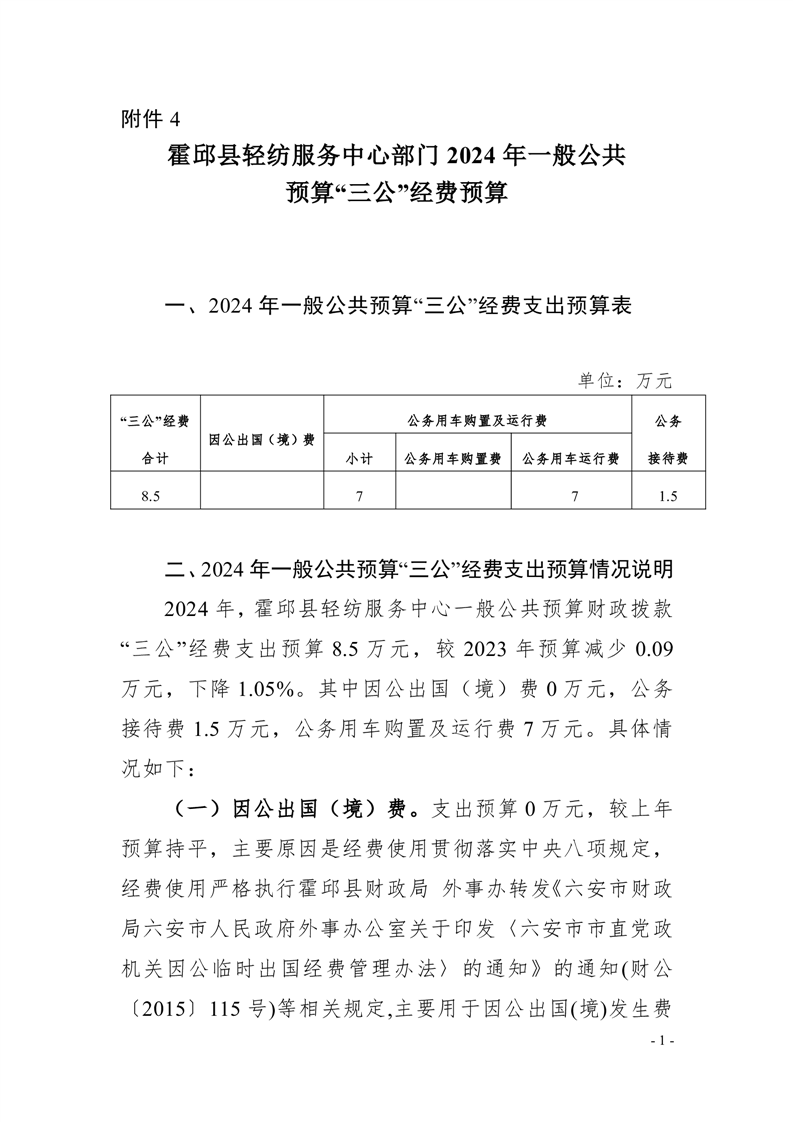 霍邱县轻纺服务中心部门 2024 年一般公共预算“三公”经费预算
