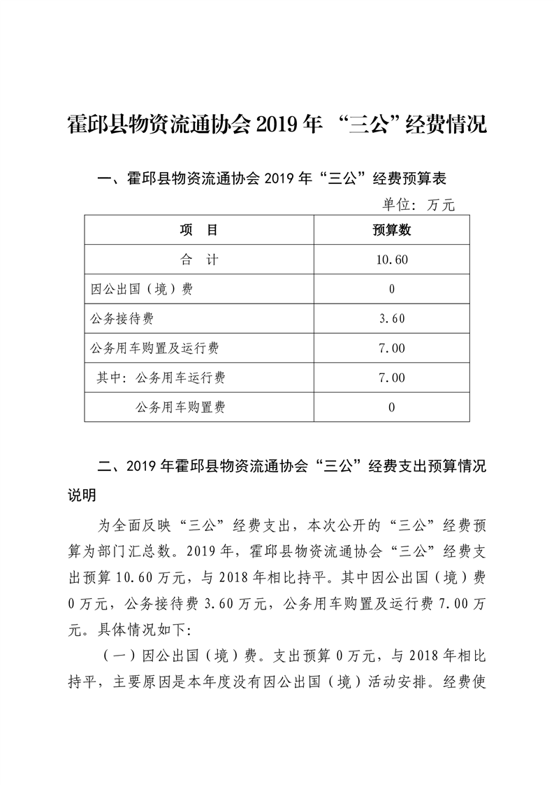 霍邱县物资流通协会2019年部门“三公”经费预算公开