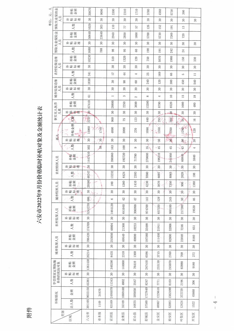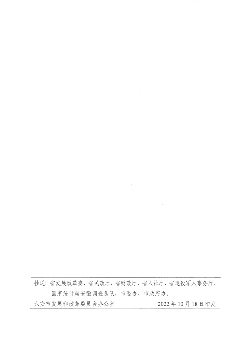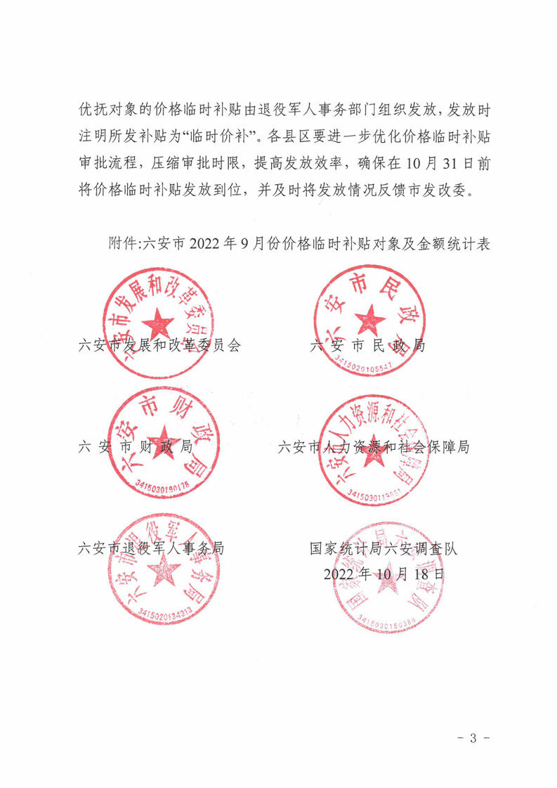 六安市发展和改革委员会 六安市民政局 六安市财政局 六安市人力资源和社会保障局 六安市退役军人事务局 国家统计局六安调查队关于发放2022年9月份价格临时补贴的通知