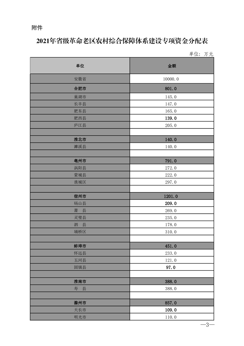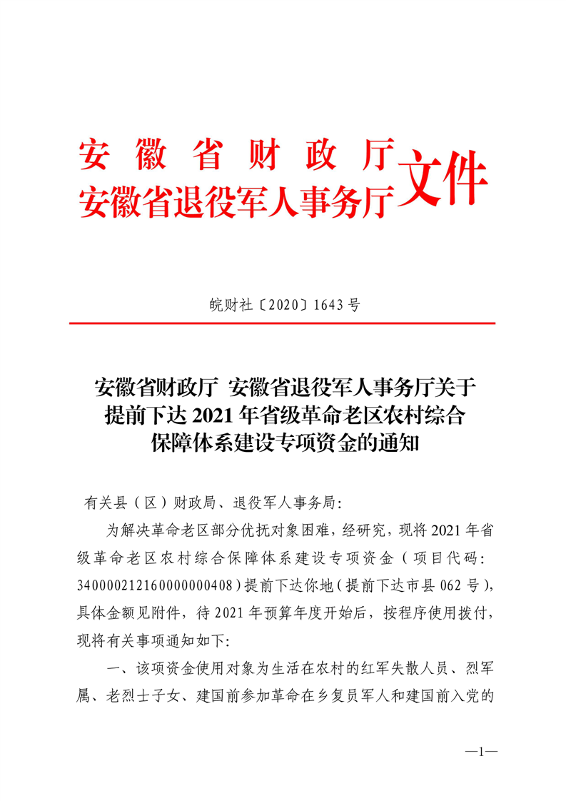 安徽省财政厅 安徽省退役军人事务厅 关于提前下达2021年省级革命老区农村综合保障体系建设专项资金的通知