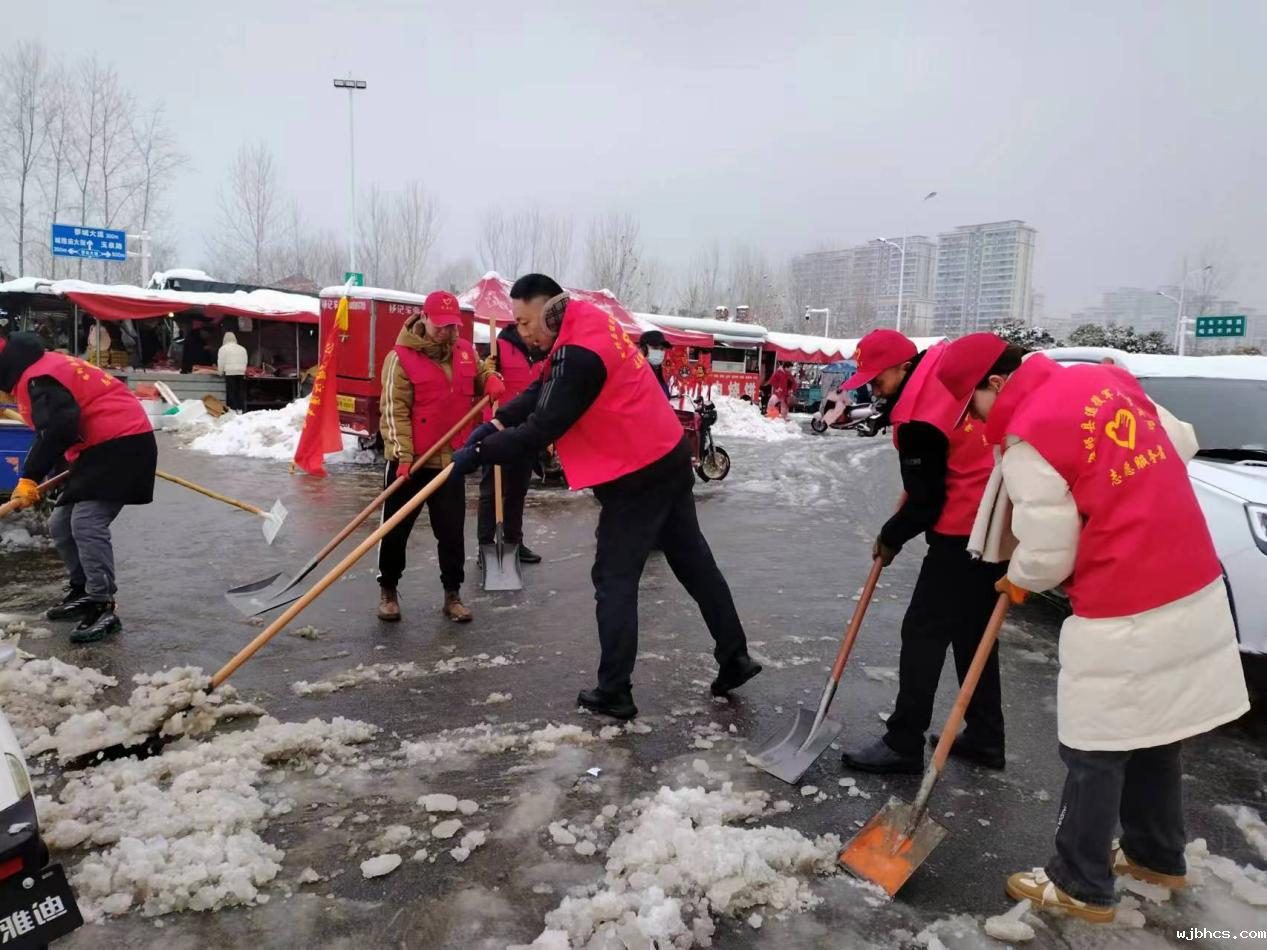 该局主要领导亲自安排部署,发挥党建引领示范作用,组织局机关和下属事业单位党员干部到育英嘉苑包保片区铲除积雪。志愿者们迎着冰雪寒风,用铲锹铲除路面厚厚的积雪和坚硬结冰。方便了卖菜群众、更方便了买菜群众置办年货,“红耀江淮”志愿服务队服在雪白的天地中愈发明艳。