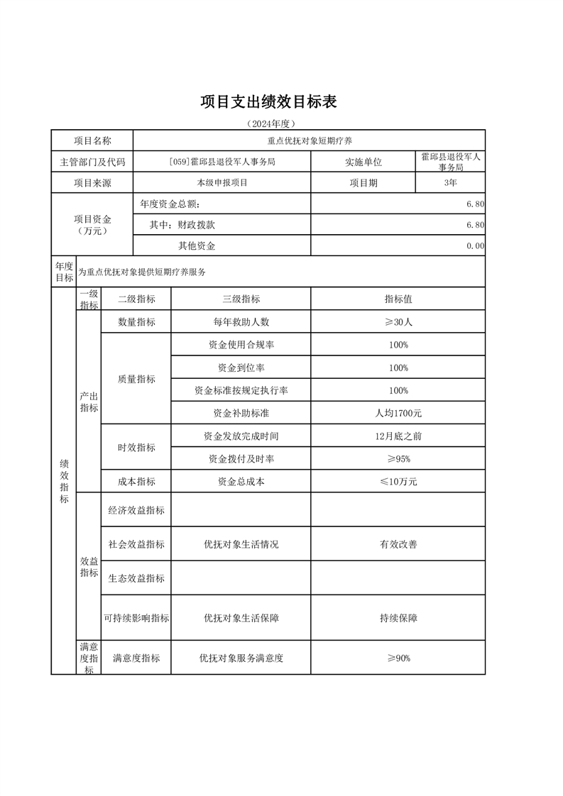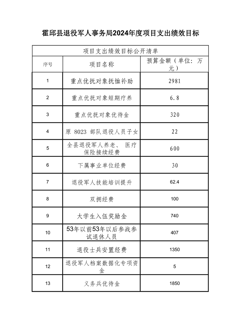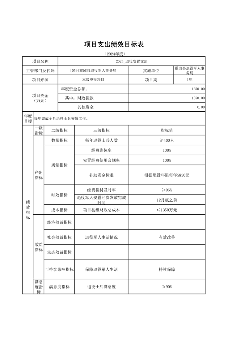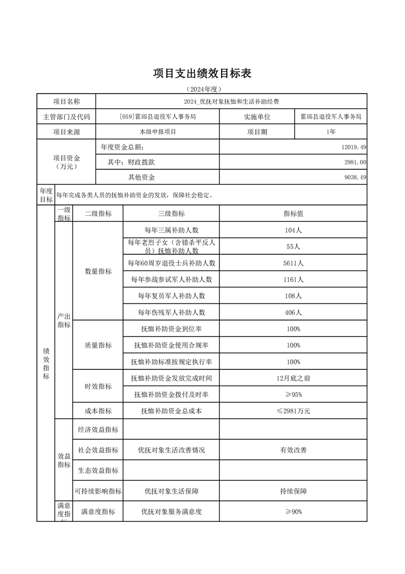 【项目绩效目标】霍邱县退役军人事务局2024年项目支出绩效目标表
