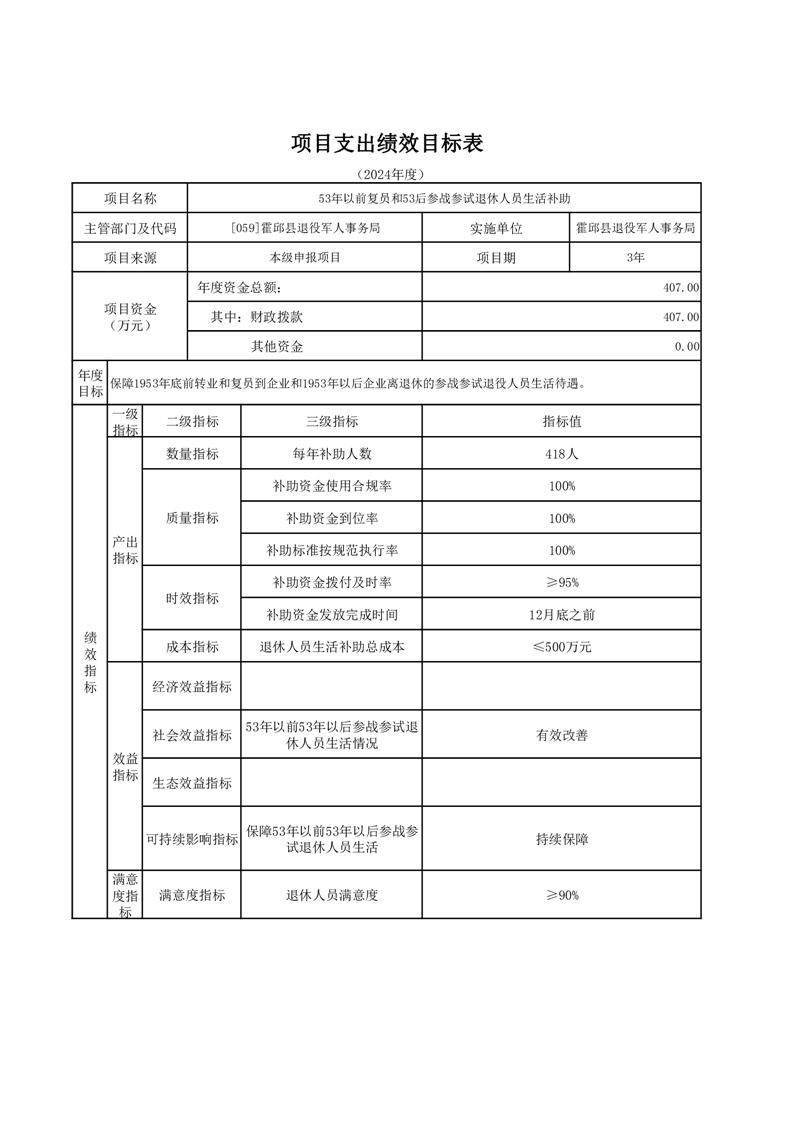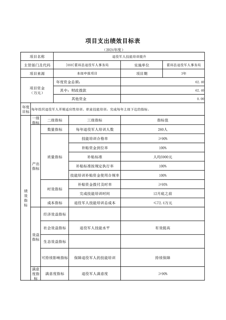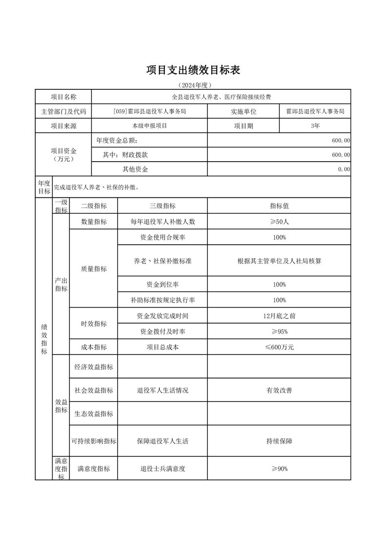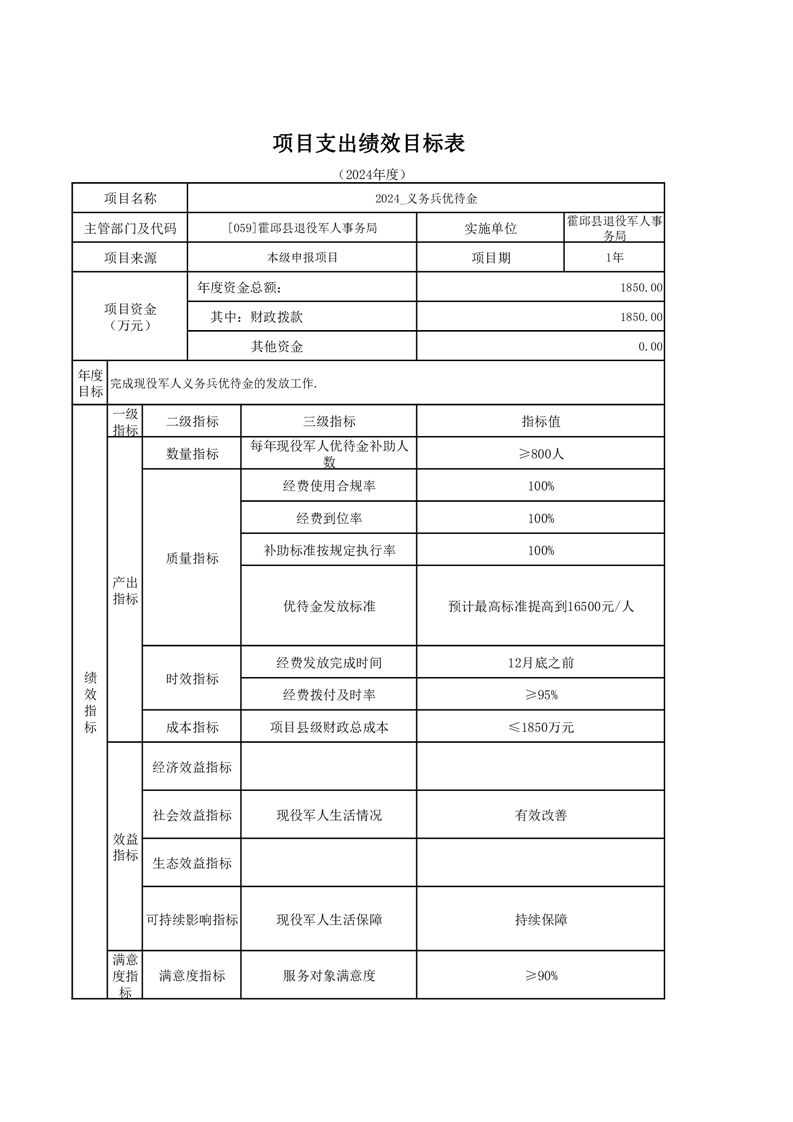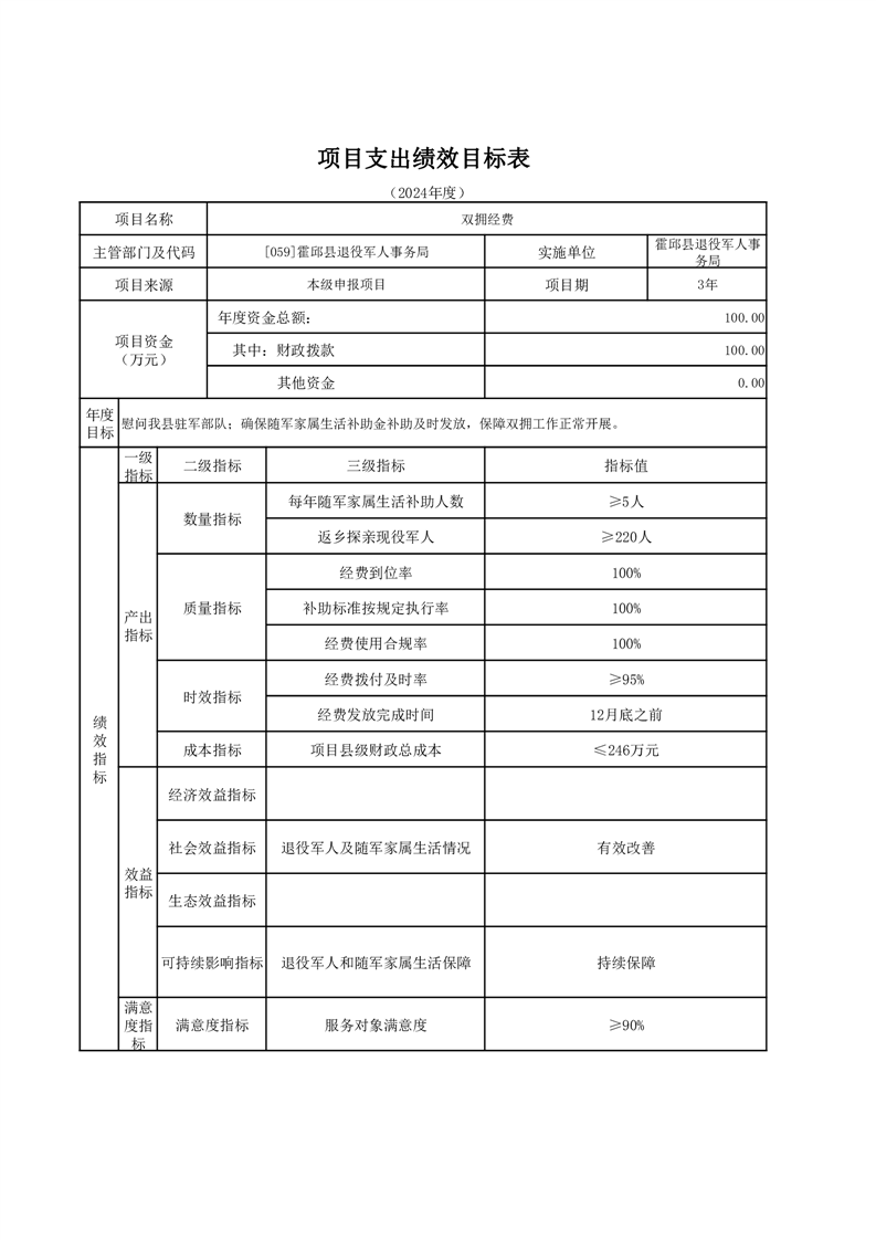 【项目绩效目标】霍邱县退役军人事务局2024年项目支出绩效目标表