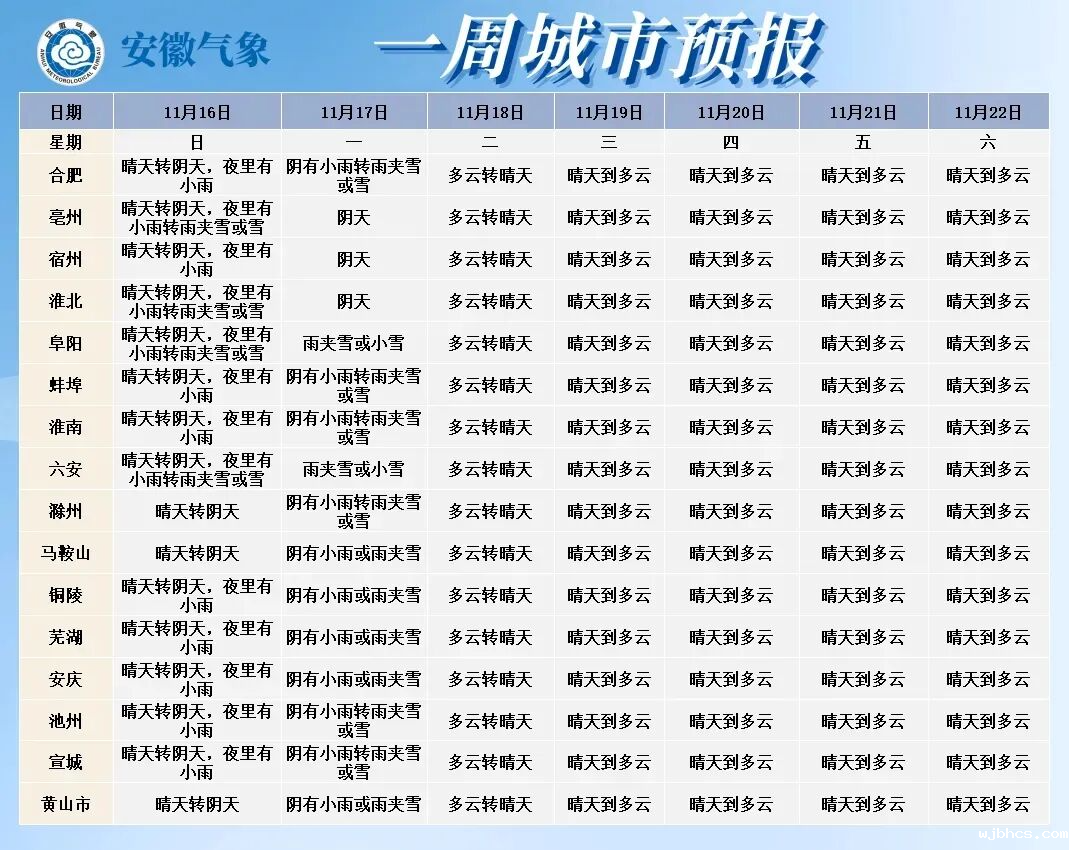 据省气象台预报,16日夜里全省大部分地区有小雨,其中淮河以北部分地区和大别山区转雨夹雪或雪。17日淮河以北西南部有雨夹雪或雪;沿淮淮河以南有小雨,其中大别山区有雨夹雪或雪、局部冻雨,皖南山区有小雨转雨夹雪或雪。18-24日全省以晴到多云天气为主。