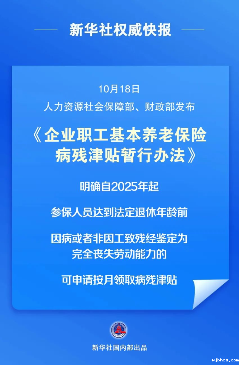 人力资源社会保障部、财政部日前发布《企业职工基本养老保险病残津贴暂行办法》。办法明确,自2025年1月1日起,企业职工基本养老保险参保人员达到法定退休年龄前,因病或者非因工致残经鉴定为完全丧失劳动能力的,可以申请按月领取病残津贴。