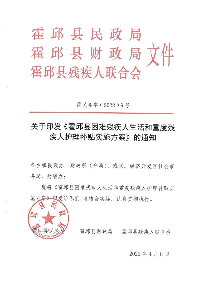 【政策文件】霍邱县困难残疾人生活补贴和重度残疾人护理补贴实施方案