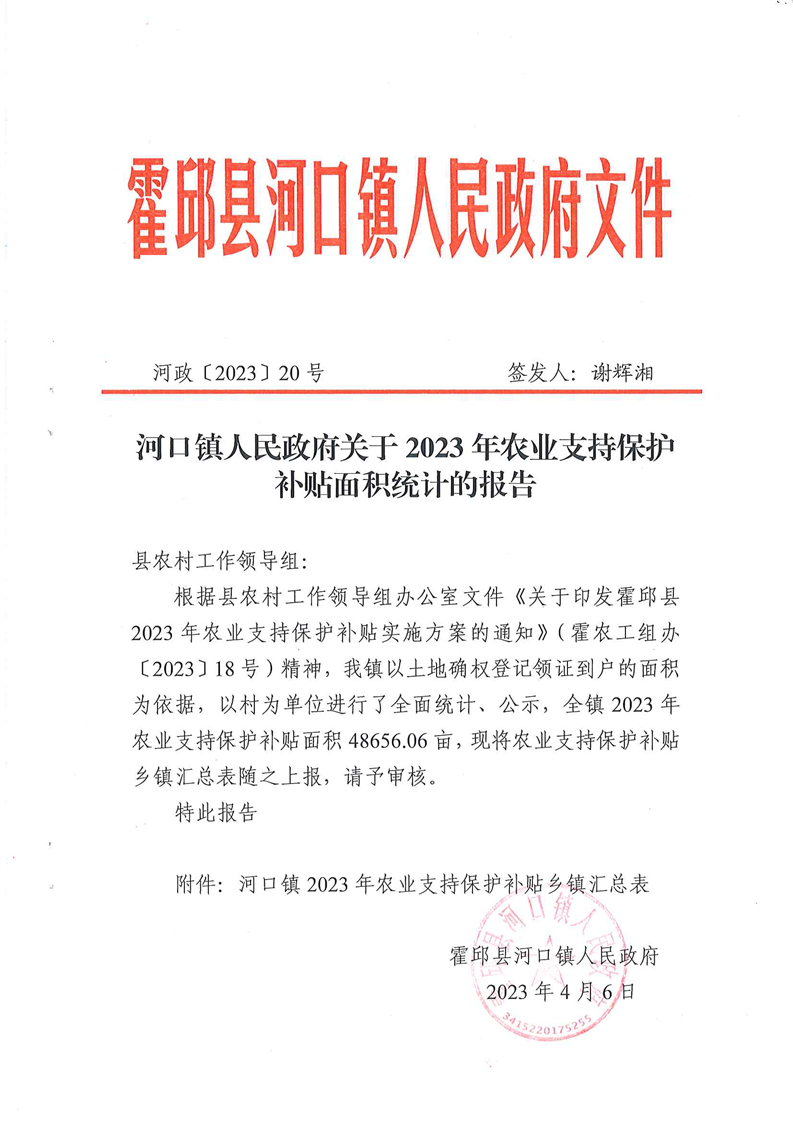 霍邱县河口镇人民政府关于2023 年农业支持保护补贴面积统计的报告
