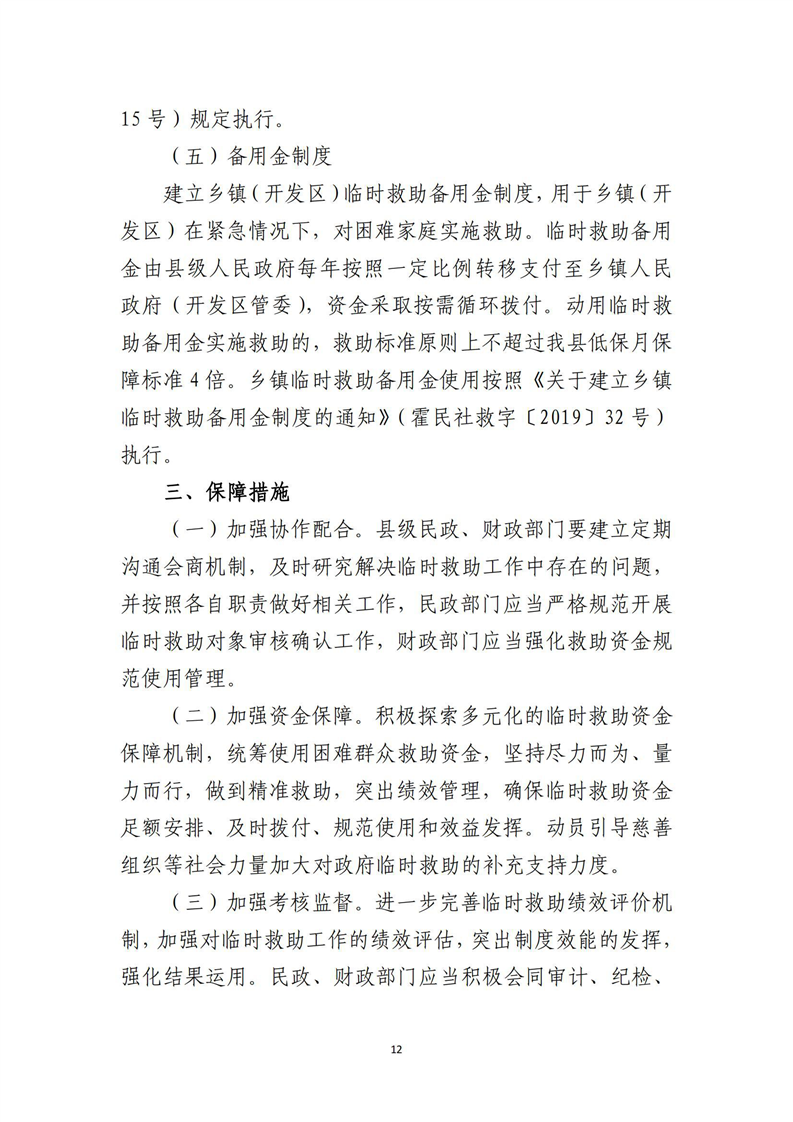 关于印发《霍邱县困难群众救助实施方案之城乡最低生活保障实施方案、特困人员救助供养实施方案、临时救助实施方案》的通知
