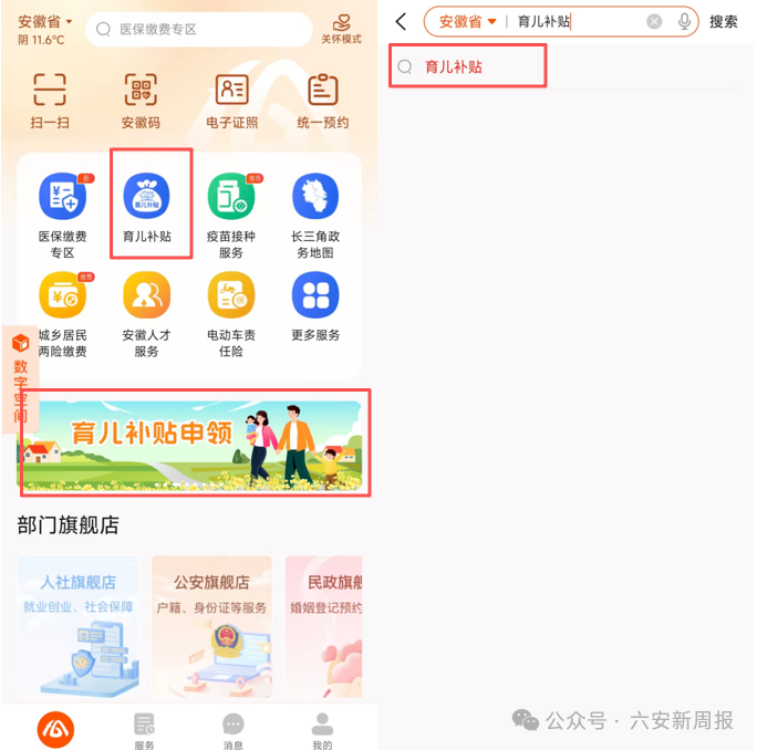 1.打开“皖事通”APP,通过首页九宫格、轮播图或者在搜索框搜索“育儿补贴”,点击进入服务。