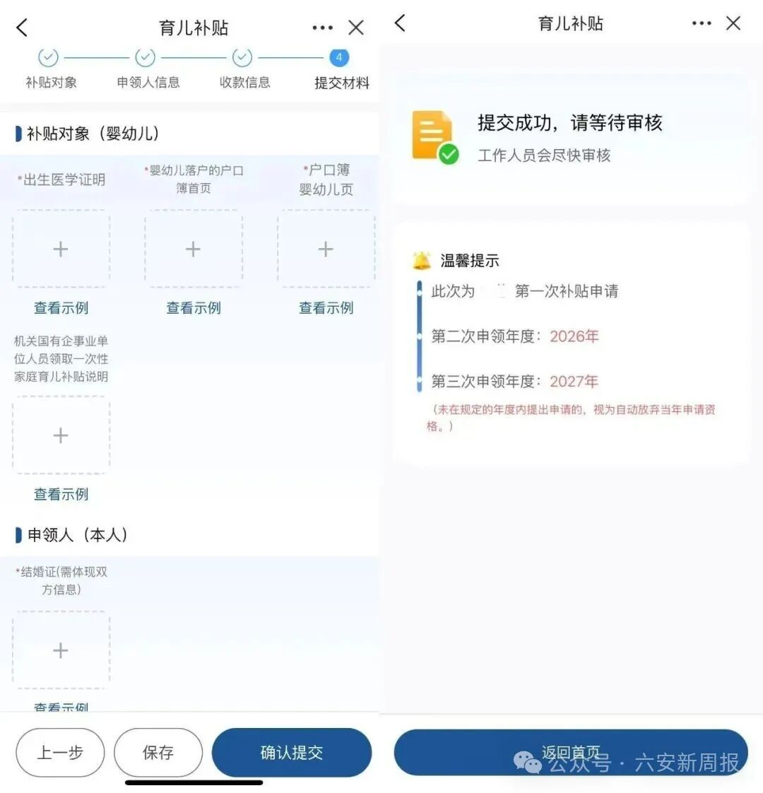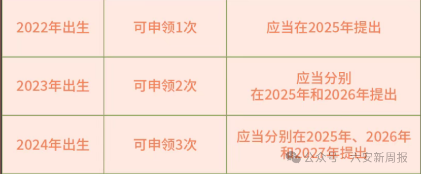 (1)对于2025年1月1日及之后出生的婴幼儿,首次申请应当在出生当年或次年提出,并在之后的连续两个年度分别提出续领申请。
