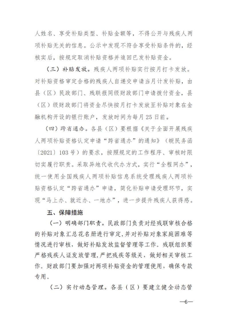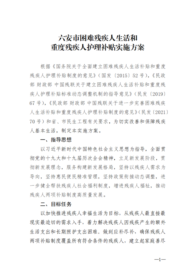 【实施方案】六安市民政局 六安市财政局 六安市残联关于印发《六安市困难残疾人生活和重度残疾人护理补贴实施方案》的通知