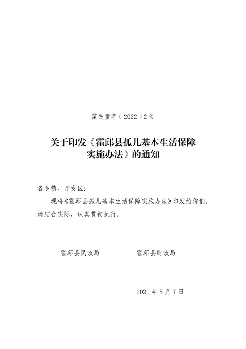 转发:关于印发《霍邱县孤儿基本生活保障实施办法》的通知