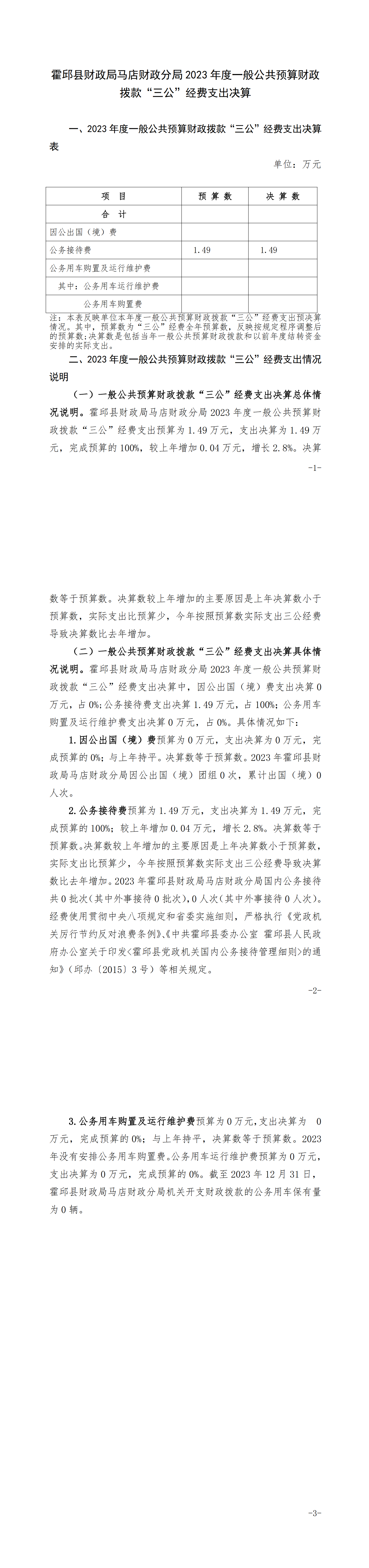 霍邱县财政局马店财政分局2023年度一般公共预算财政拨款“三公”经费支出决算
