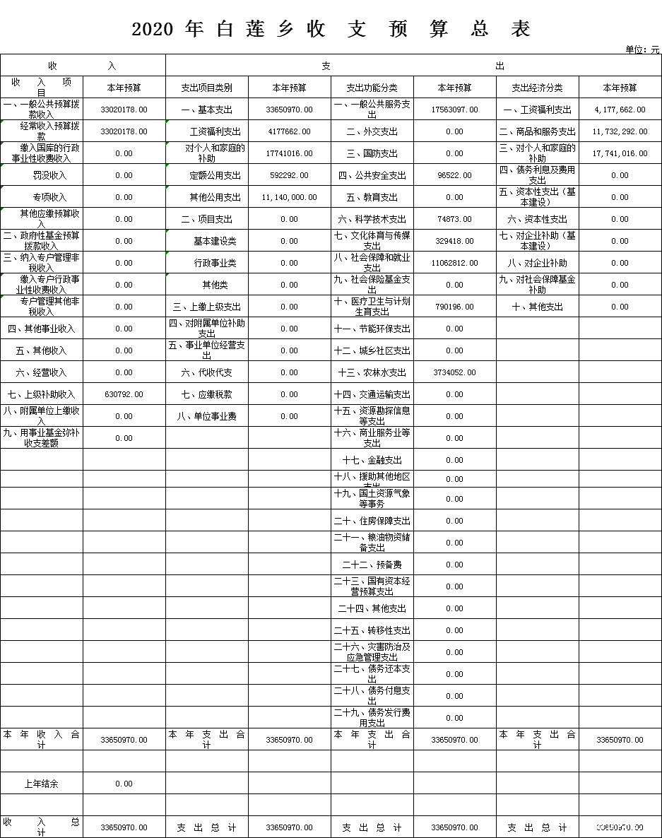2、支出预算安排,2020年财政一般预算支出为3365万元。其中:一般公共服务支出为1756万元,公共安全支出9.6万元,科学技术支出7.5万元,文化体育与传媒支出33万元,社会保障和就业支出1106万元,医疗卫生与计划生育支出79万元,农林水支出373万元。