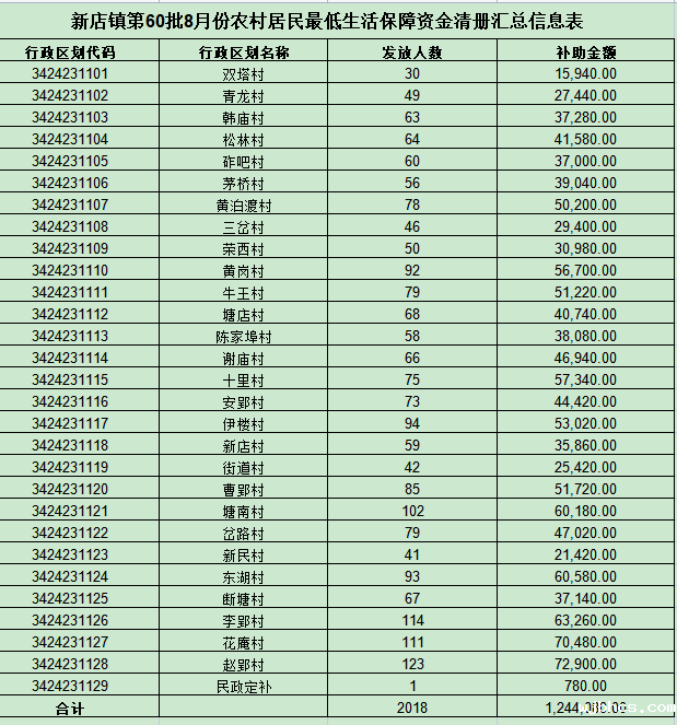新店镇2023年8月份城乡居民最低生活保障资金汇总信息表