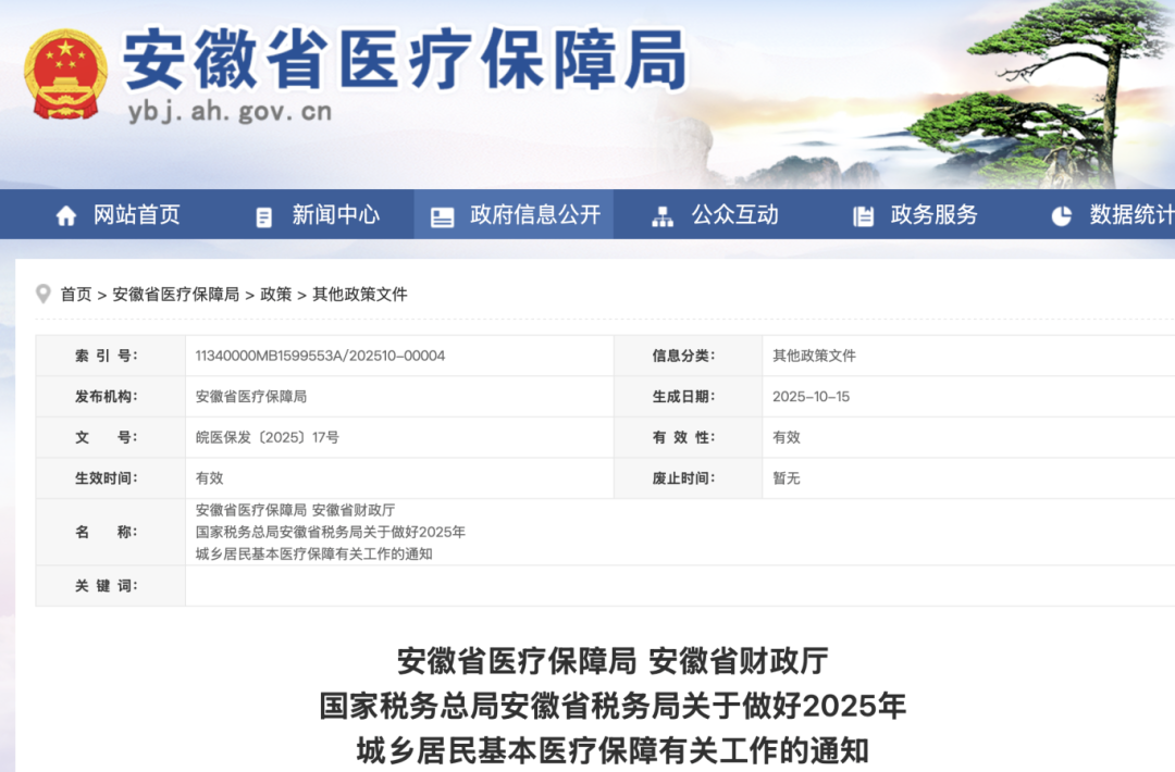 近日,安徽发布通知,2025年居民医保个人缴费标准可与上年持平,每人每年不低于400元,全省集中征缴期确定为2025年10月20日至12月31日,待遇保障周期为2026年1月1日至12月31日。