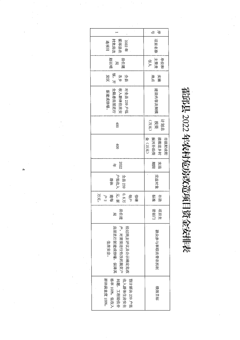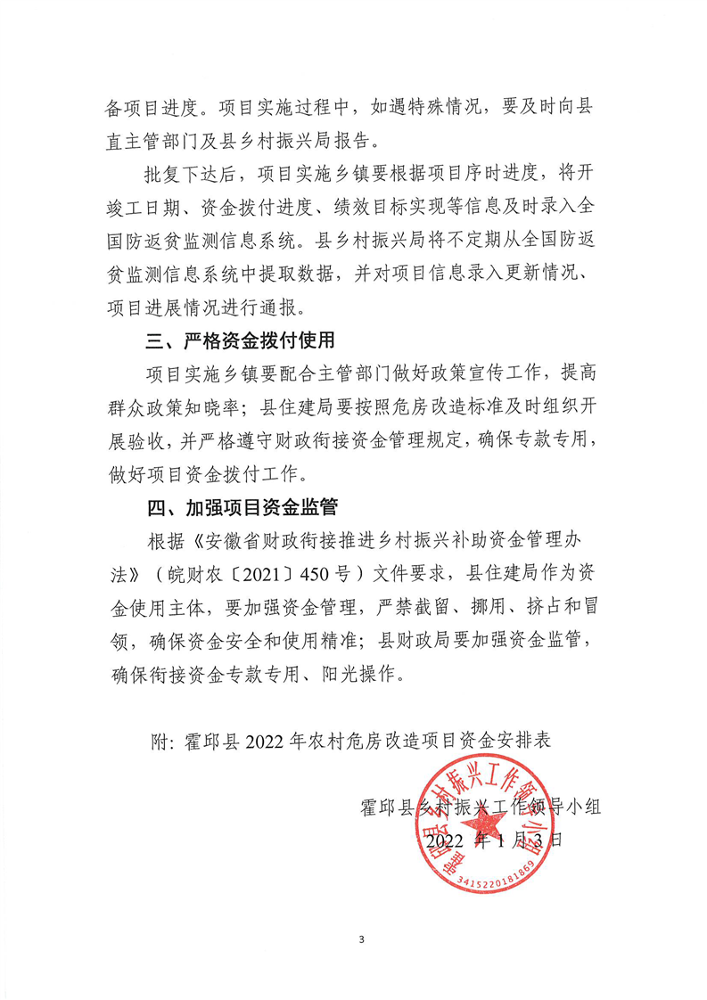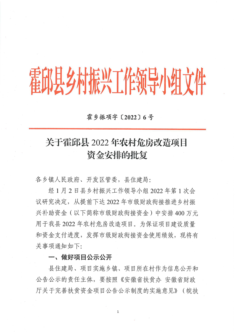 【财政专项资金管理和使用情况】关于霍邱县2022年农村危房改造项目资金安排的批复