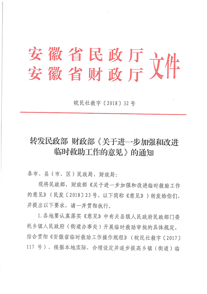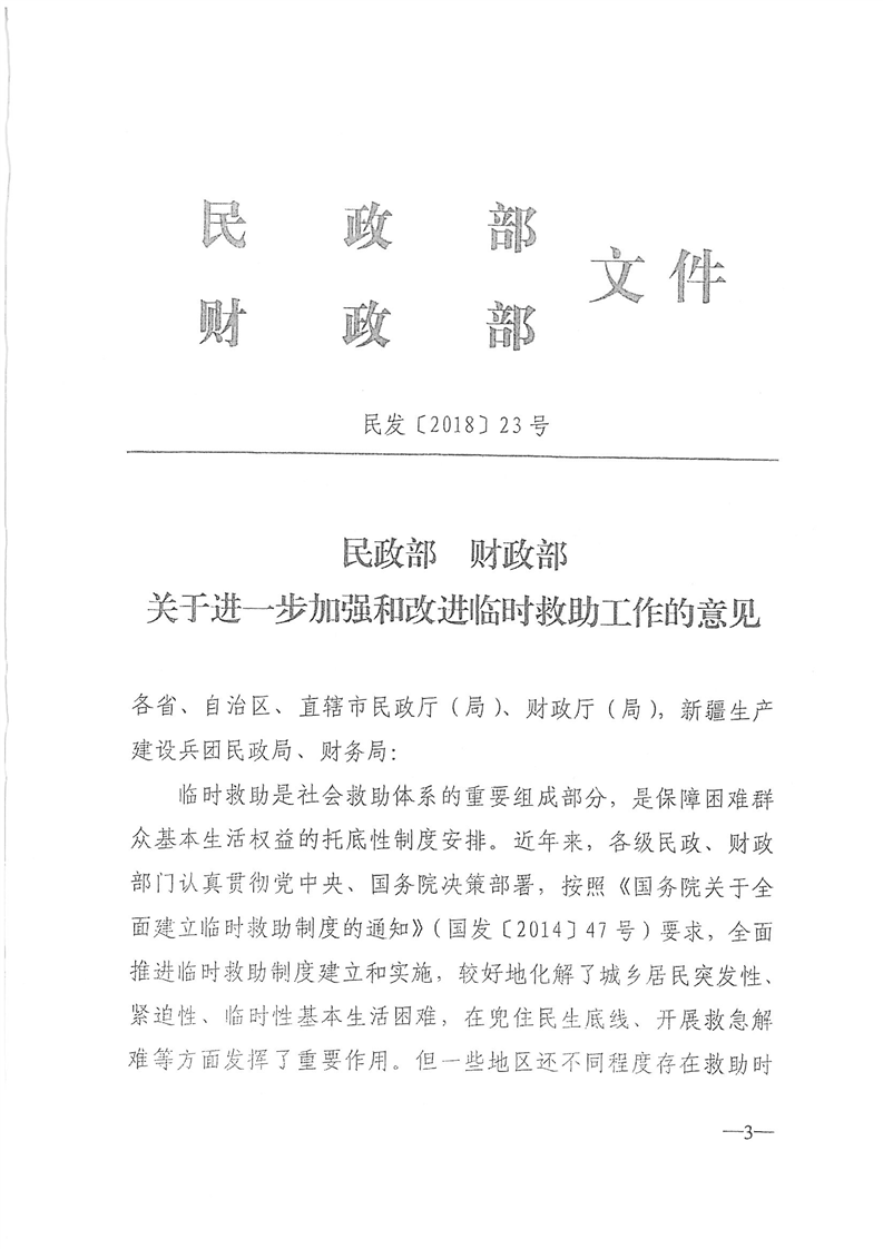 民政部财政部《关于进一步加强和改进临时救助工作的意见》 (民发〔2018〕23号)