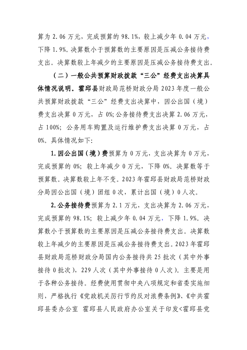 霍邱县财政局范桥财政分局2023年度一般公共预算财政拨款“三公”经费支出决算