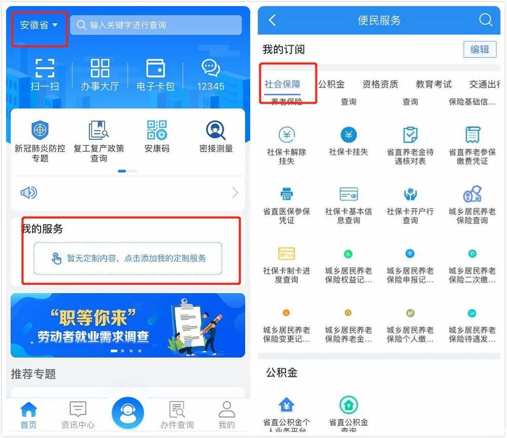 【第二步】登录“皖事通”APP,进入首页,并选择“安徽省”,进入“我的服务”,点击“社会保障”,找到您想要办理的事项。