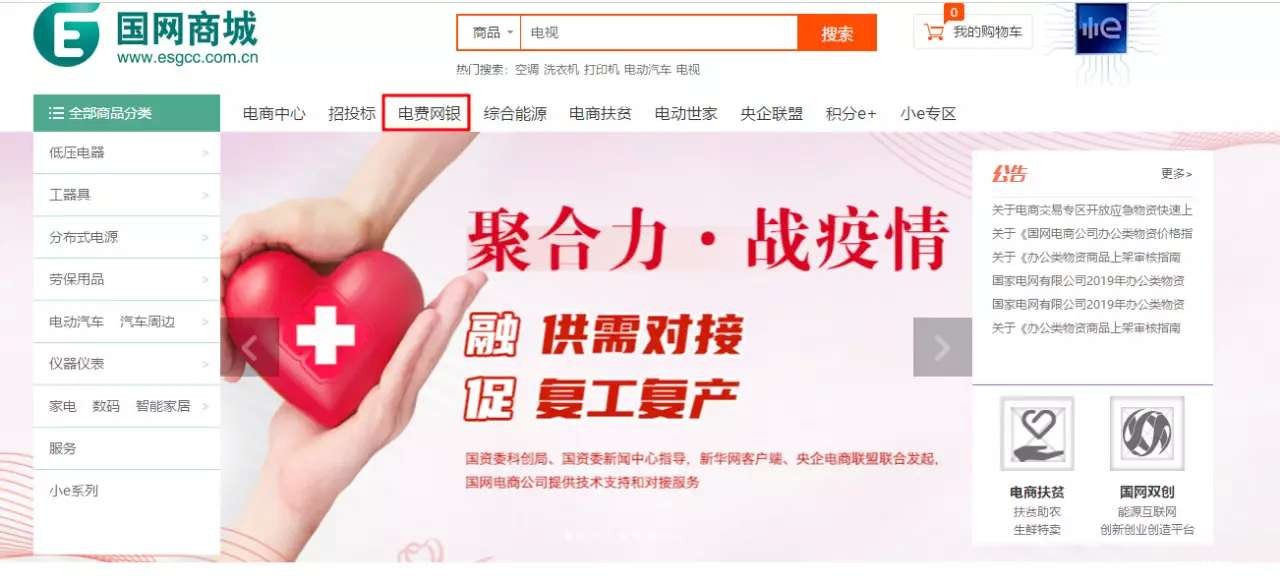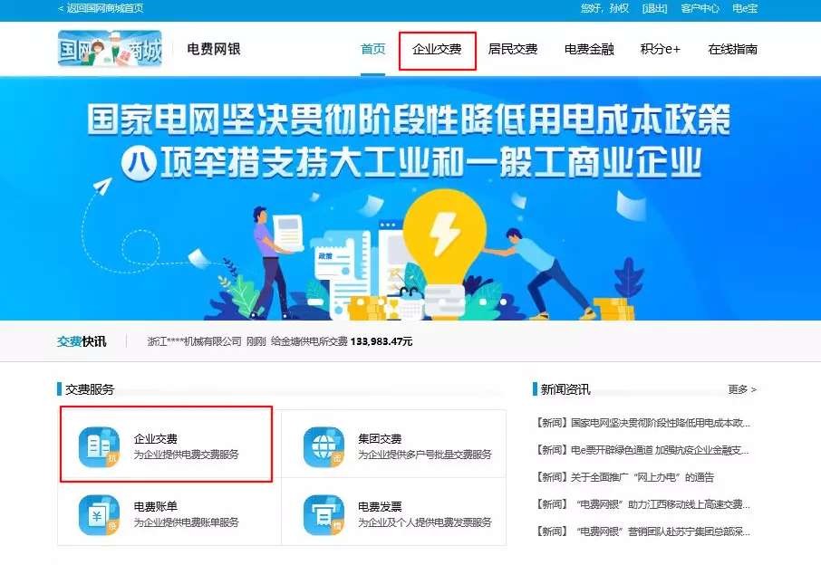 第一步:在国网商城首页登录进入“电费网银”专区,并点击“企业交费”。