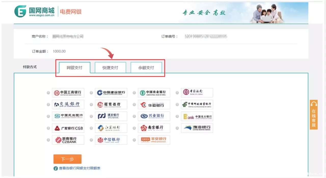 支持“个人网银支付”、“快捷支付”、“余额支付”3种支付方式。