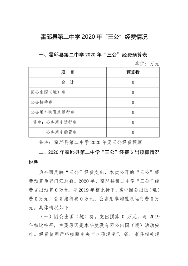 霍邱县第二中学2020年部门“三公”经费预算公开