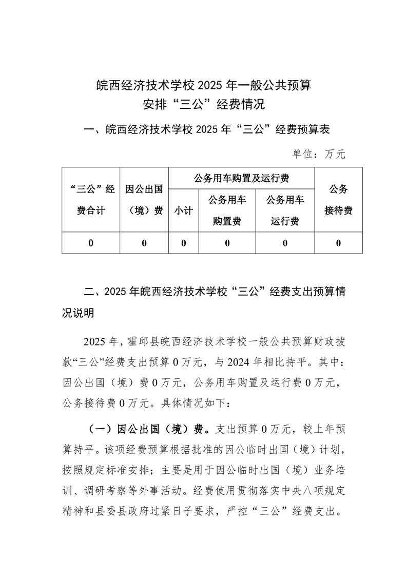皖西经济技术学校2025年一般公共预算安排“三公”经费情况公开